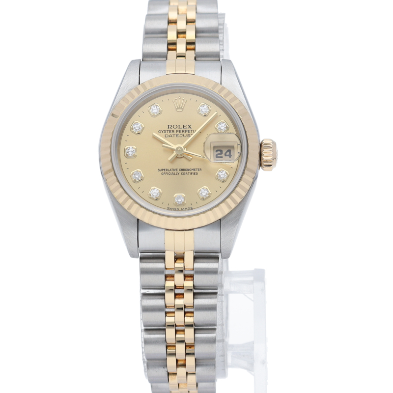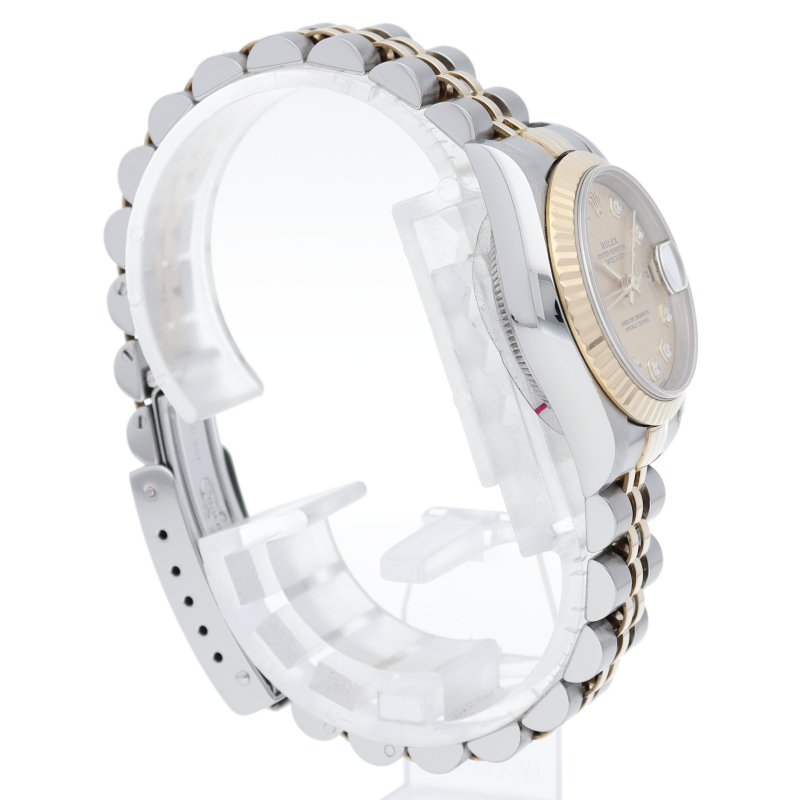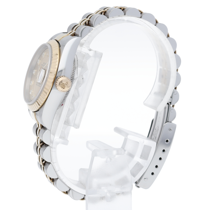 ロレックスの人気ドレスウォッチで幅広年齢層に人気のデイトジャスト。イエローゴールドとステンレスのコンビ仕様に10Pダイヤが施されてます。