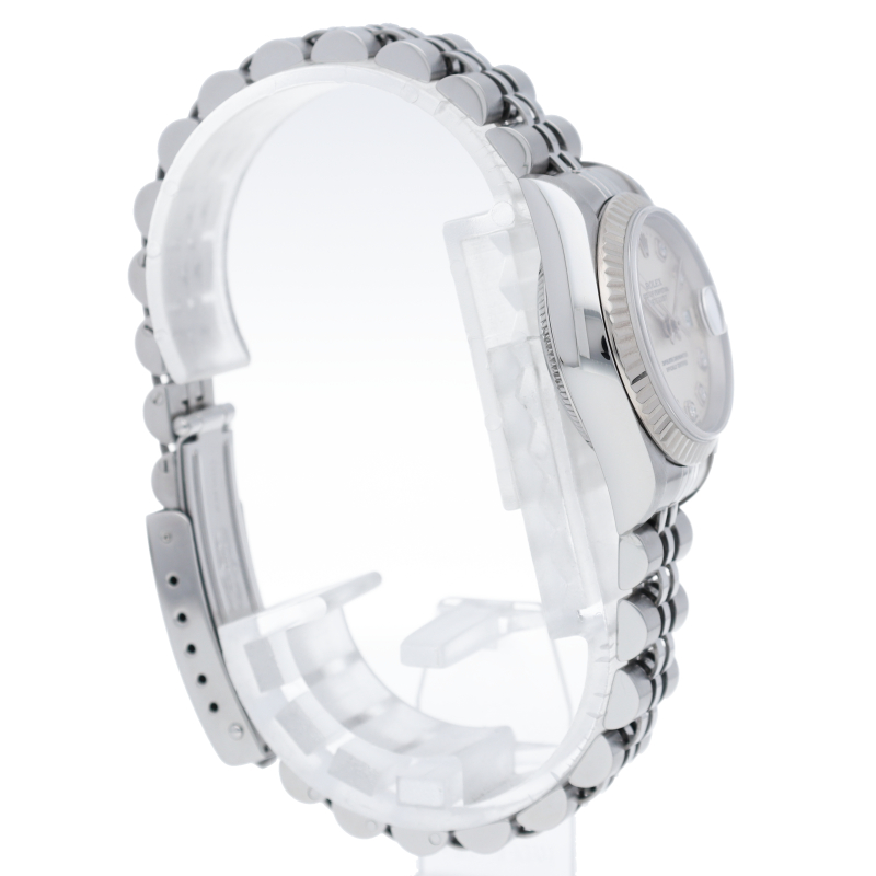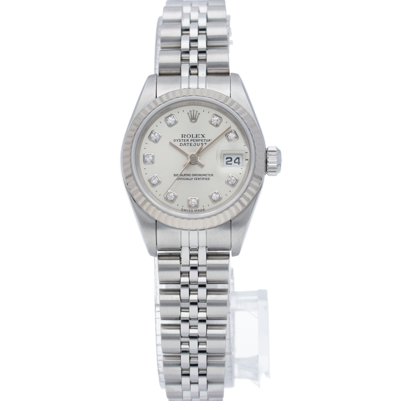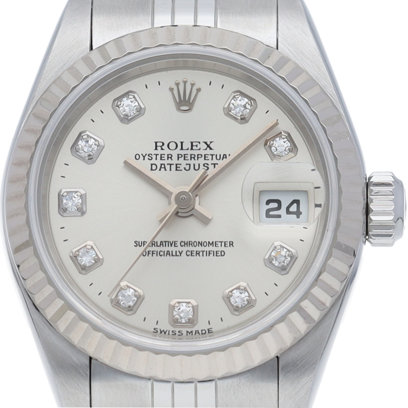ロレックスのドレスウォッチで幅広い年齢層に愛されているデイトジャスト。ホワイトゴールドとステンレスのコンビ仕様に10Pダイヤが施され豪華です。