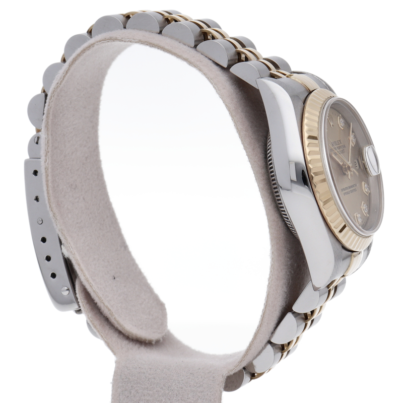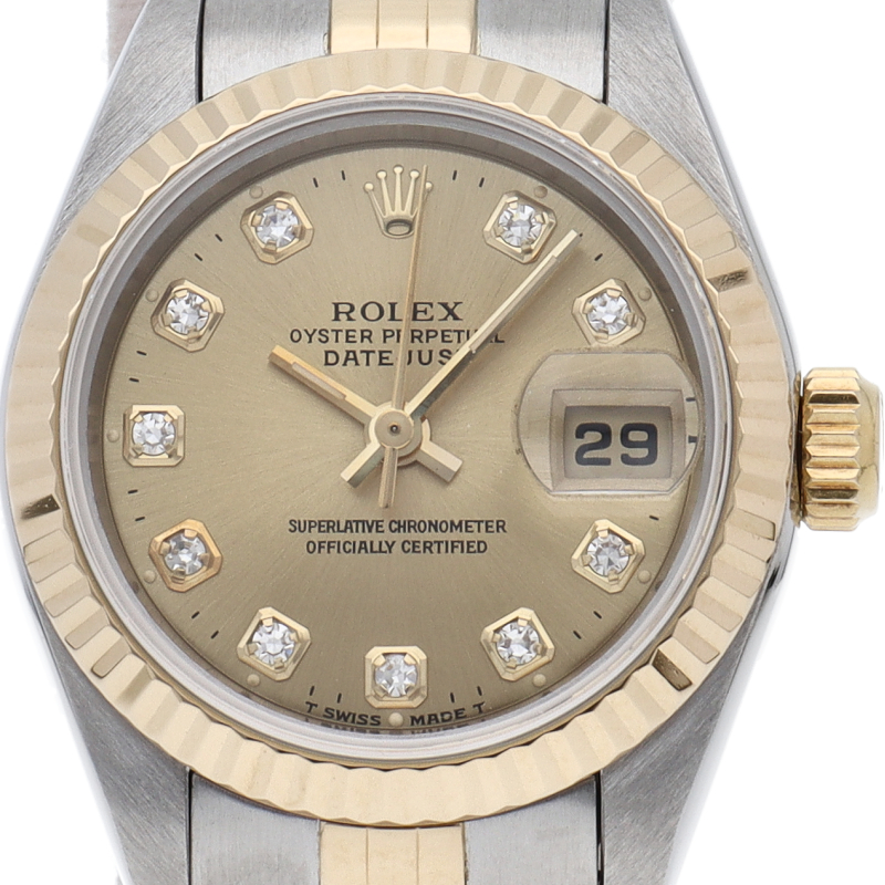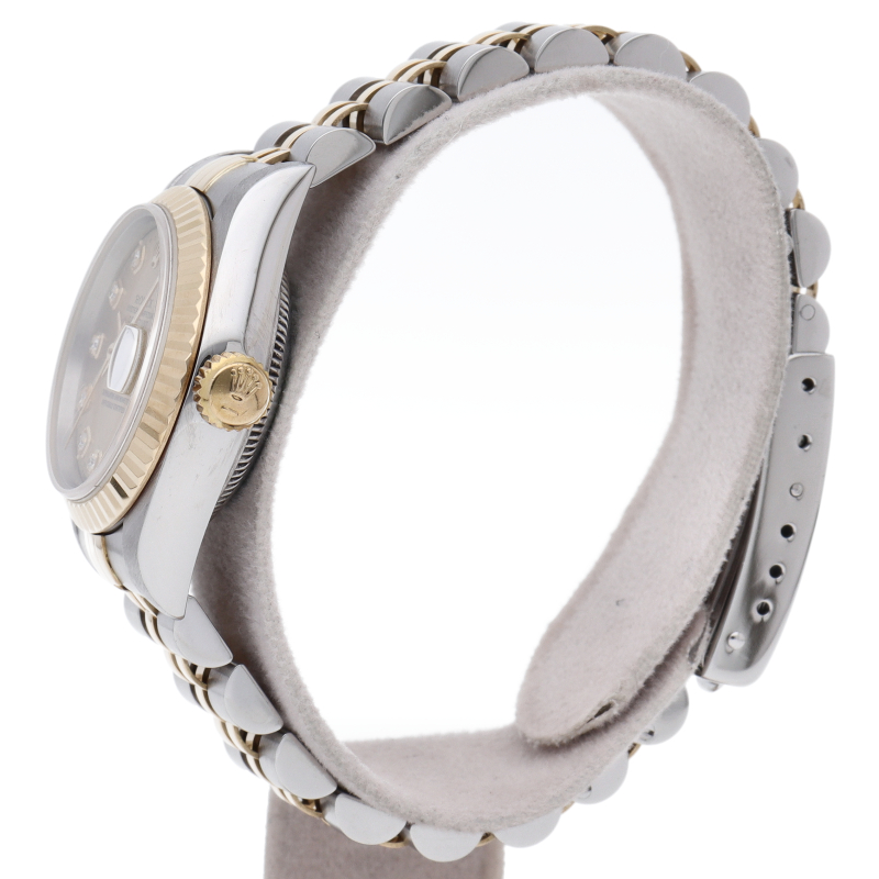ロレックスの人気ドレスウォッチで幅広年齢層に人気のデイトジャスト。イエローゴールドとステンレスのコンビ仕様に10Pダイヤが施されてます。