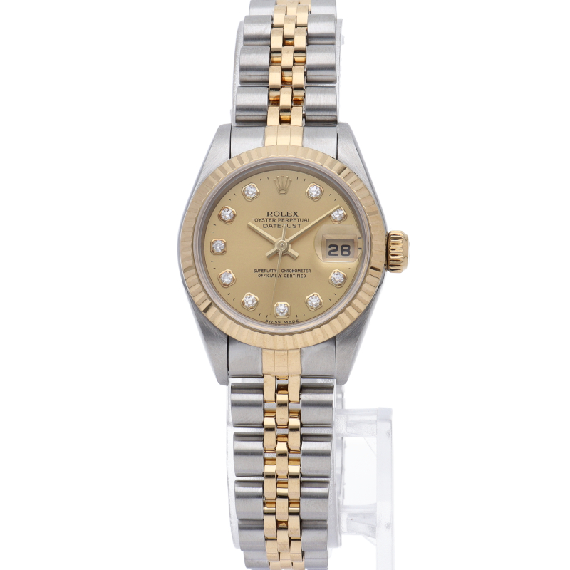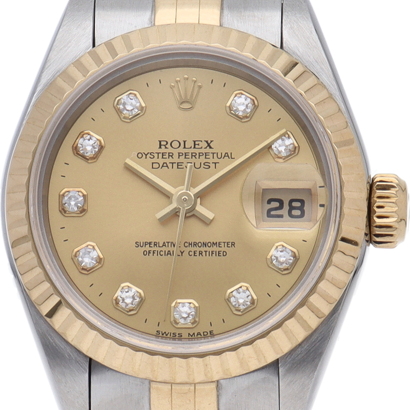 ロレックスの人気ドレスウォッチで幅広年齢層に人気のデイトジャスト。イエローゴールドとステンレスのコンビ仕様に10Pダイヤが施されてます。