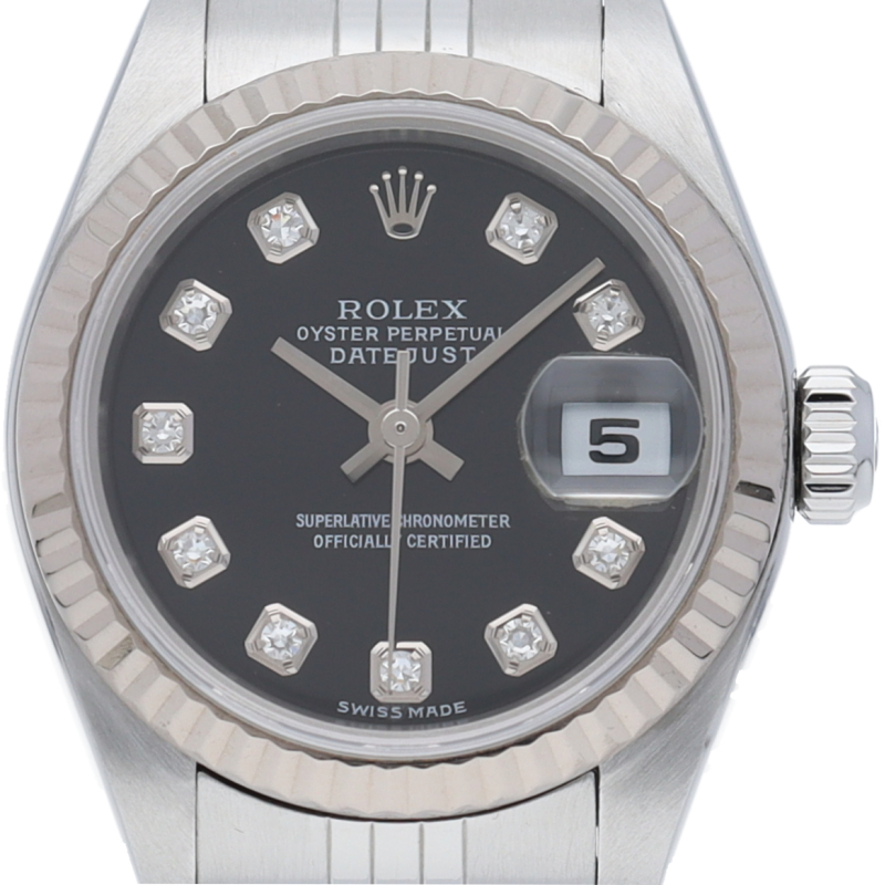 ロレックスのドレスウォッチで幅広い年齢層に愛されているデイトジャスト。ホワイトゴールドとステンレスのコンビ仕様に10Pダイヤが施され豪華です。