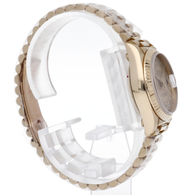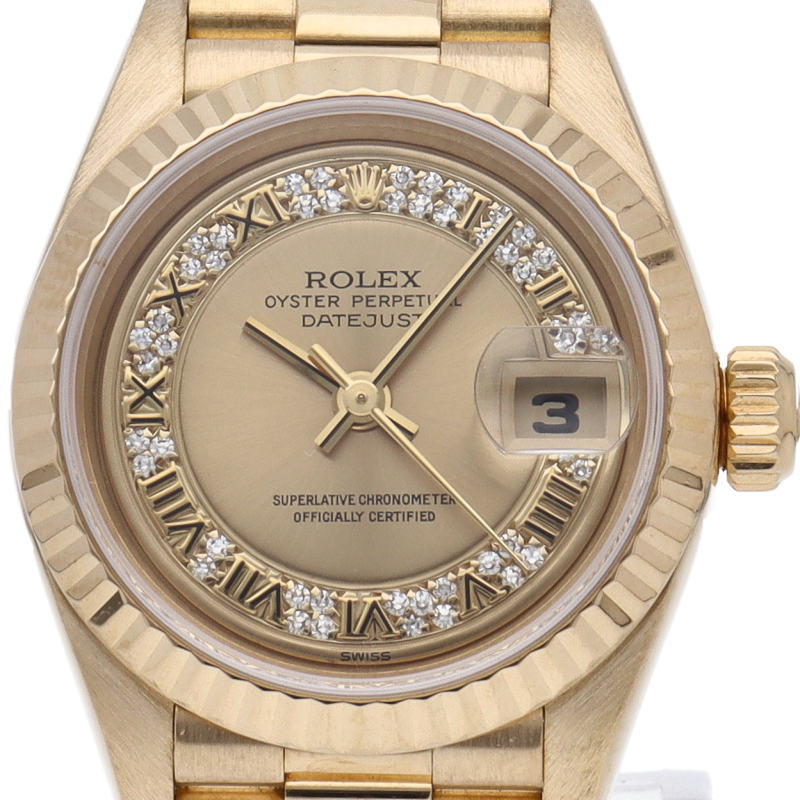 ロレックスのドレスウォッチで幅広い年齢層に愛されているデイトジャスト。イエローゴールドのケースで豪華な1本です。文字盤にはサークルダイヤ付。