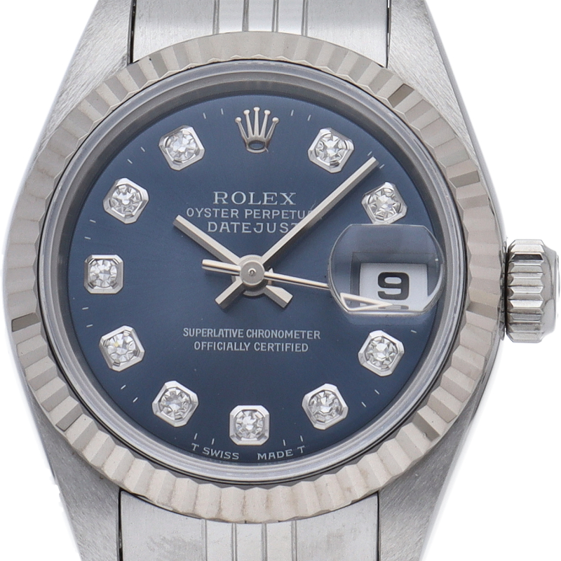 ロレックスのドレスウォッチで幅広い年齢層に愛されているデイトジャスト。ホワイトゴールドとステンレスのコンビ仕様に10Pダイヤが施され豪華です。
