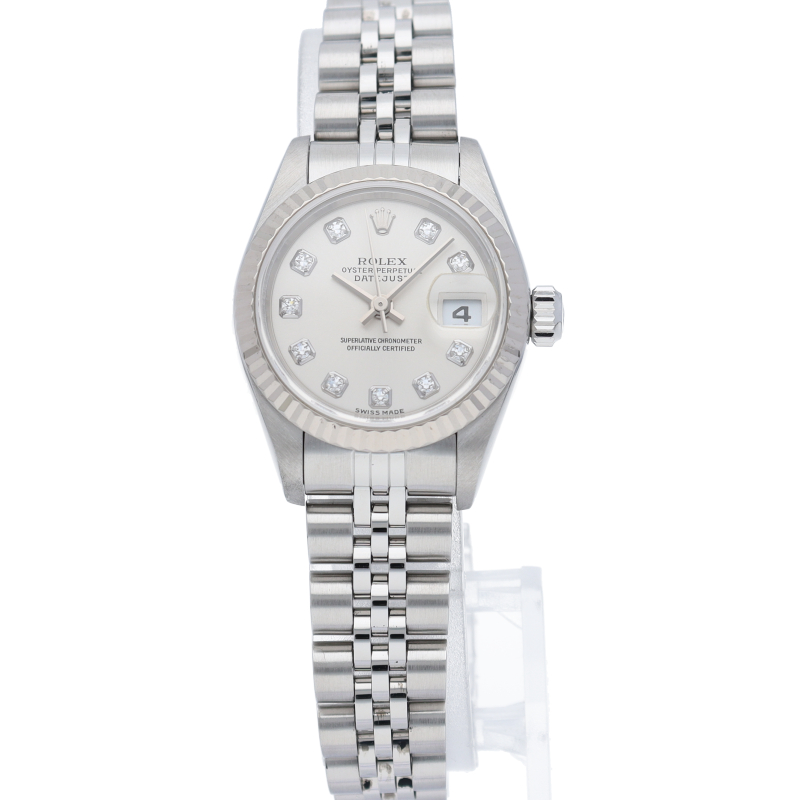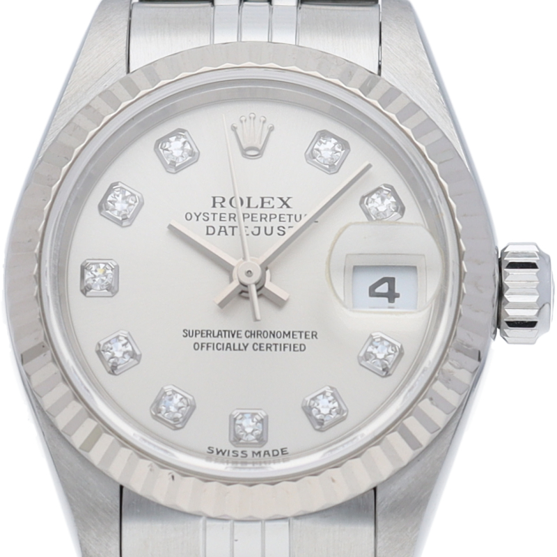 ロレックスのドレスウォッチで幅広い年齢層に愛されているデイトジャスト。ホワイトゴールドとステンレスのコンビ仕様に10Pダイヤが施され豪華です。