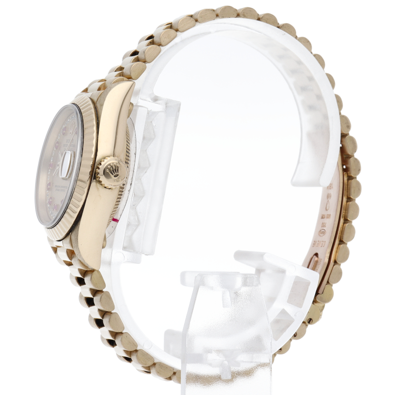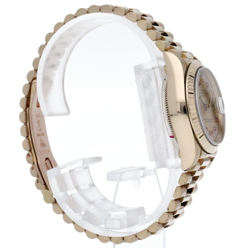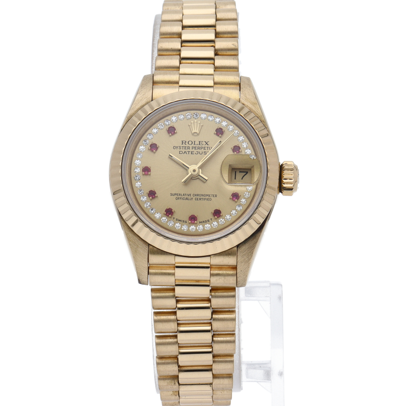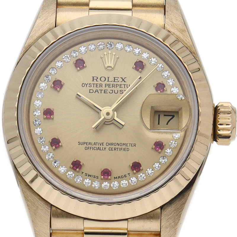 ロレックスのドレスウォッチで幅広い年齢層に愛されているデイトジャスト。イエローゴールドのケース、シャンパン文字盤にダイヤとルビーが施された豪華な1本です。