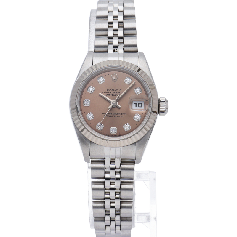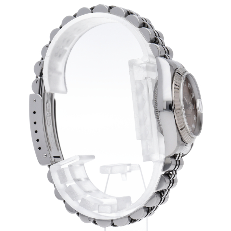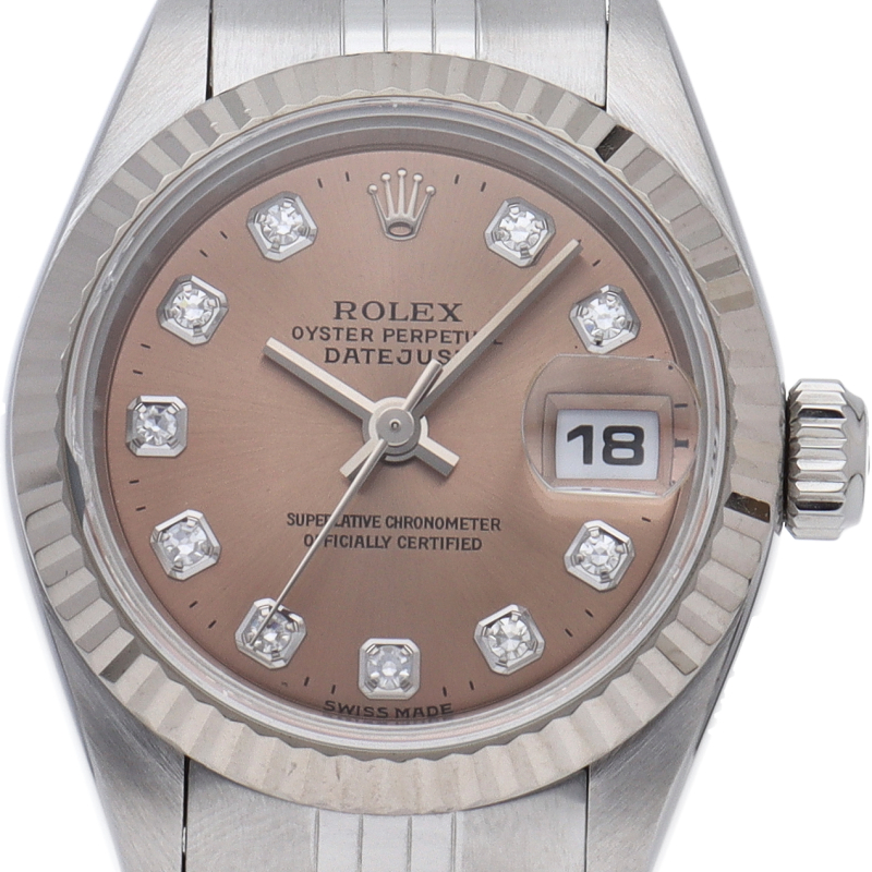 ロレックスのドレスウォッチで幅広い年齢層に愛されているデイトジャスト。ホワイトゴールドとステンレスのコンビ仕様に10Pダイヤが施され豪華です。