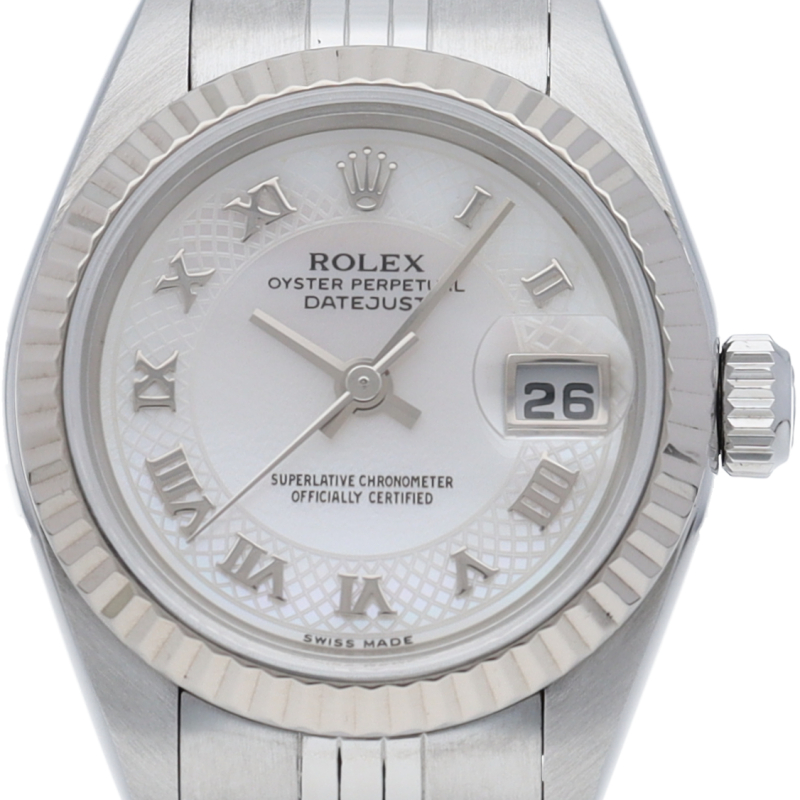 男女問わず永遠のステータスシンボルとも言えるロレックスの“デイトジャスト”。様々なバリエーションがありますが、こちらは ピンクシェル文字盤にデコレーション(格子模様)を施した希少性の高いモデルです。ゴールドの光沢にも負けないピンクシェルの柔らかな光沢感が魅力です。