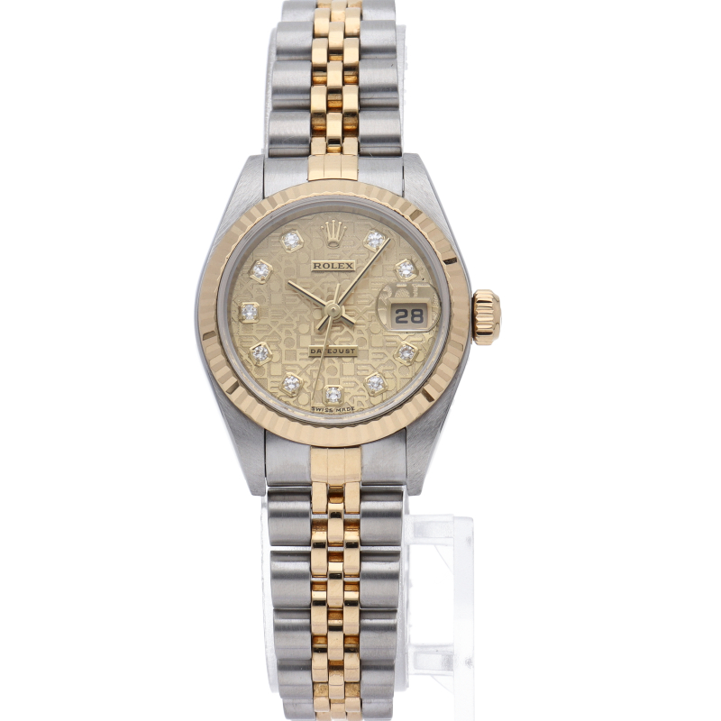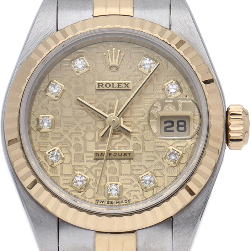 ロレックスのドレスウォッチで幅広い年齢層に愛されている「デイトジャスト」。イエローゴールドとステンレスのコンビ仕様に10Pダイヤが施され豪華です。