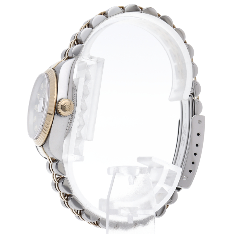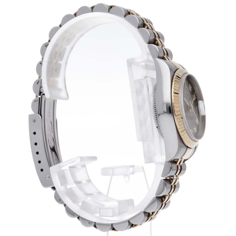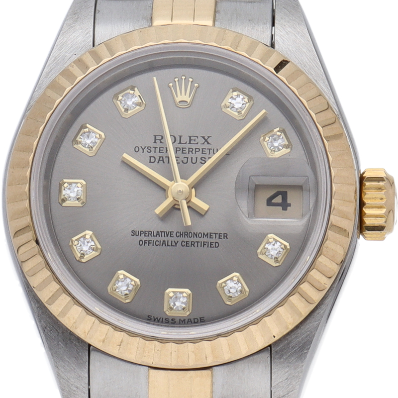 ロレックスのドレスウォッチで幅広い年齢層に愛されている「デイトジャスト」。イエローゴールドとステンレスのコンビ仕様に10Pダイヤが施され豪華です。