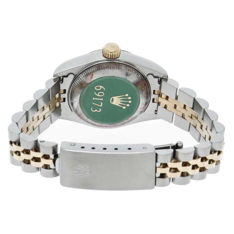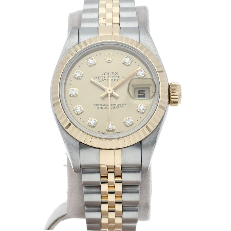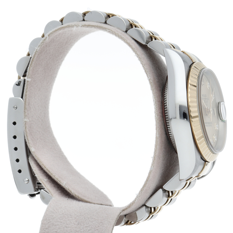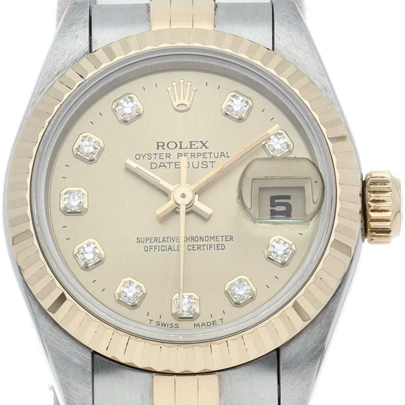 ロレックスの人気ドレスウォッチで幅広年齢層に人気のデイトジャスト。イエローゴールドとステンレスのコンビ仕様に10Pダイヤが施されてます。