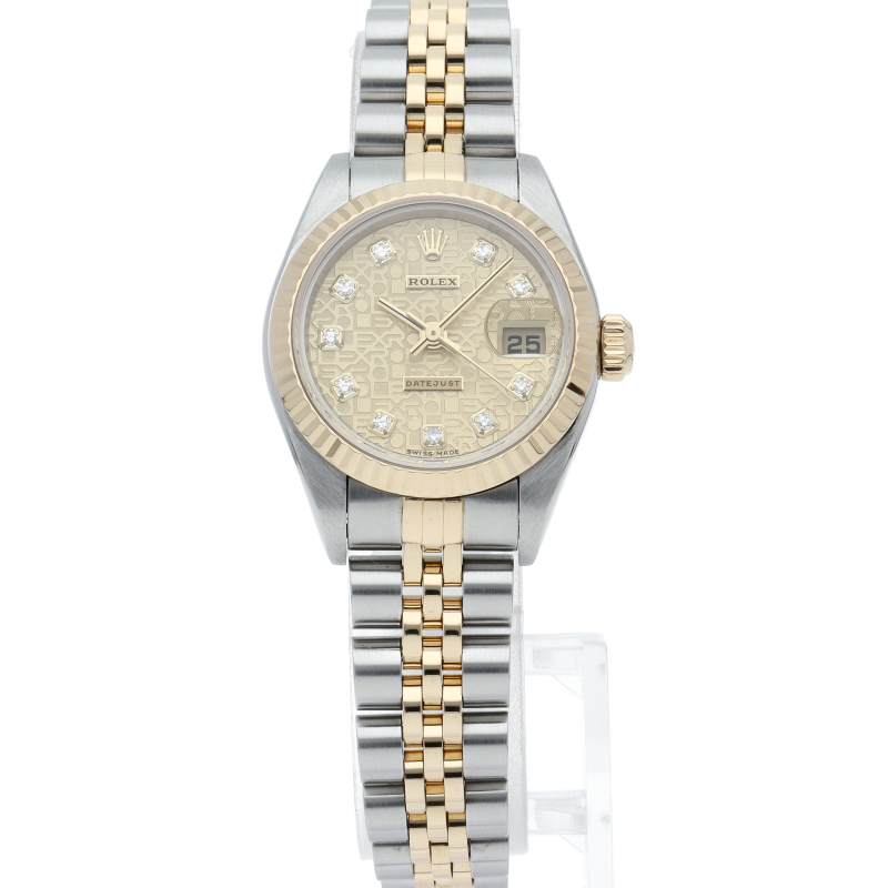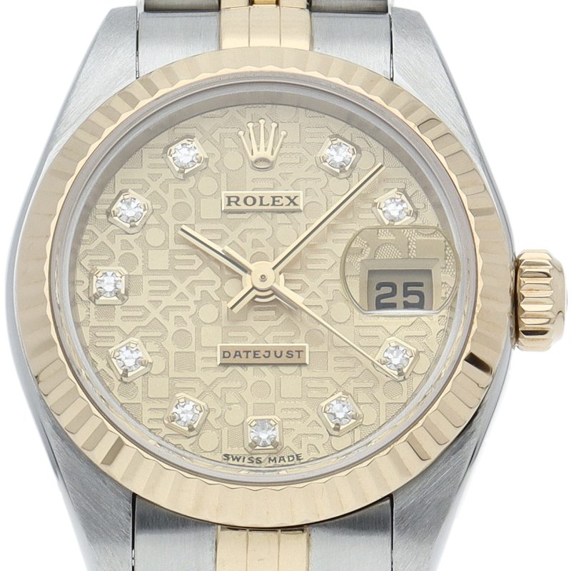 ロレックスのドレスウォッチで幅広い年齢層に愛されている「デイトジャスト」。イエローゴールドとステンレスのコンビ仕様に10Pダイヤが施され豪華です。