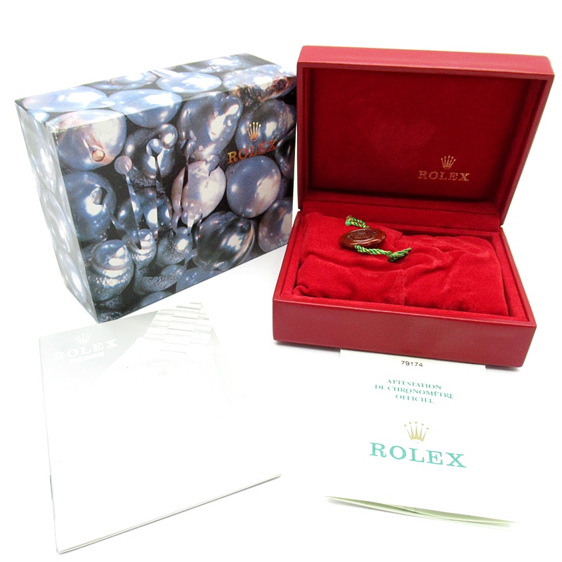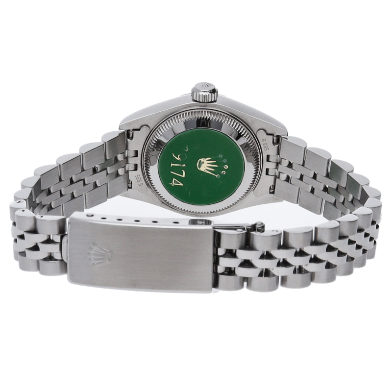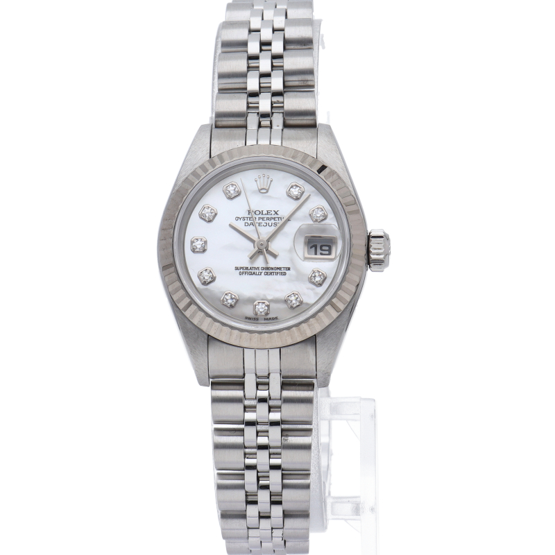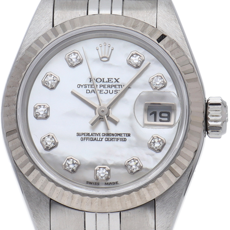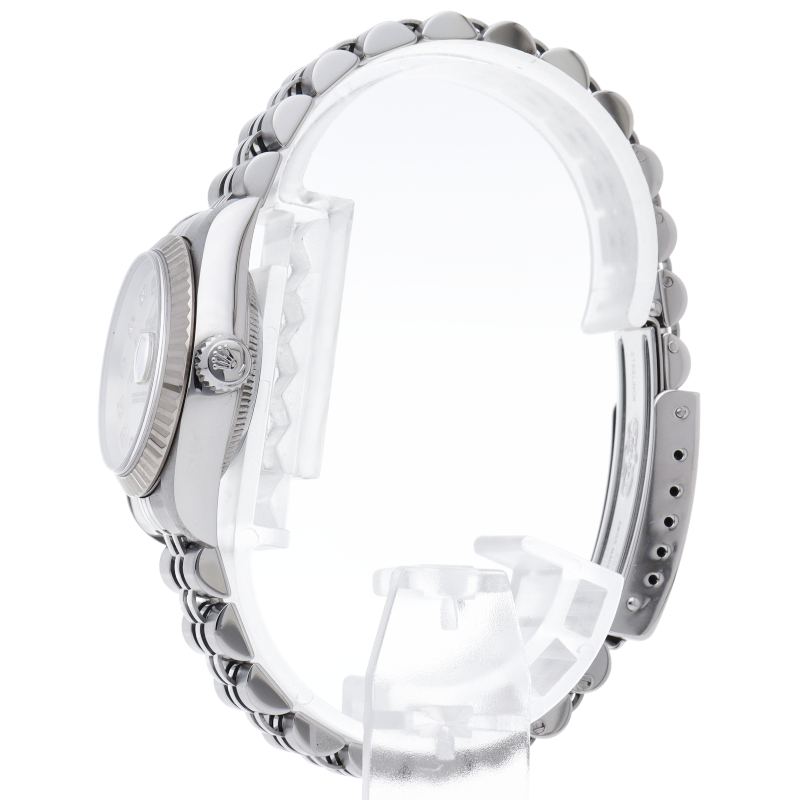 2000年頃の個体で、癖のないステンレスケースにホワイトゴールド製のフルーテッドベゼルを備えることで、文字盤とダイヤをより高貴な印象に。ダイヤが派手に感じる方もいらっしゃると思いますが、レディースの小ぶりなケースから放たれるダイヤの輝きには嫌味な印象は無く、程良いアクセントになっております。ケース径は26mmと女性の腕元にスッキリと納まり、洗練された大人の雰囲気を演出できると思います。