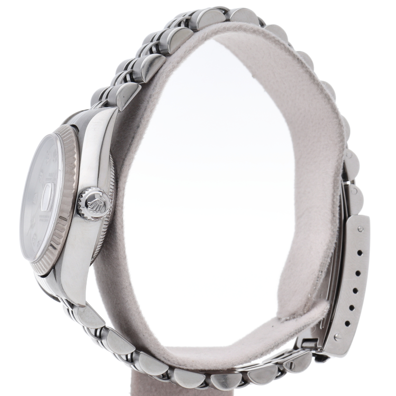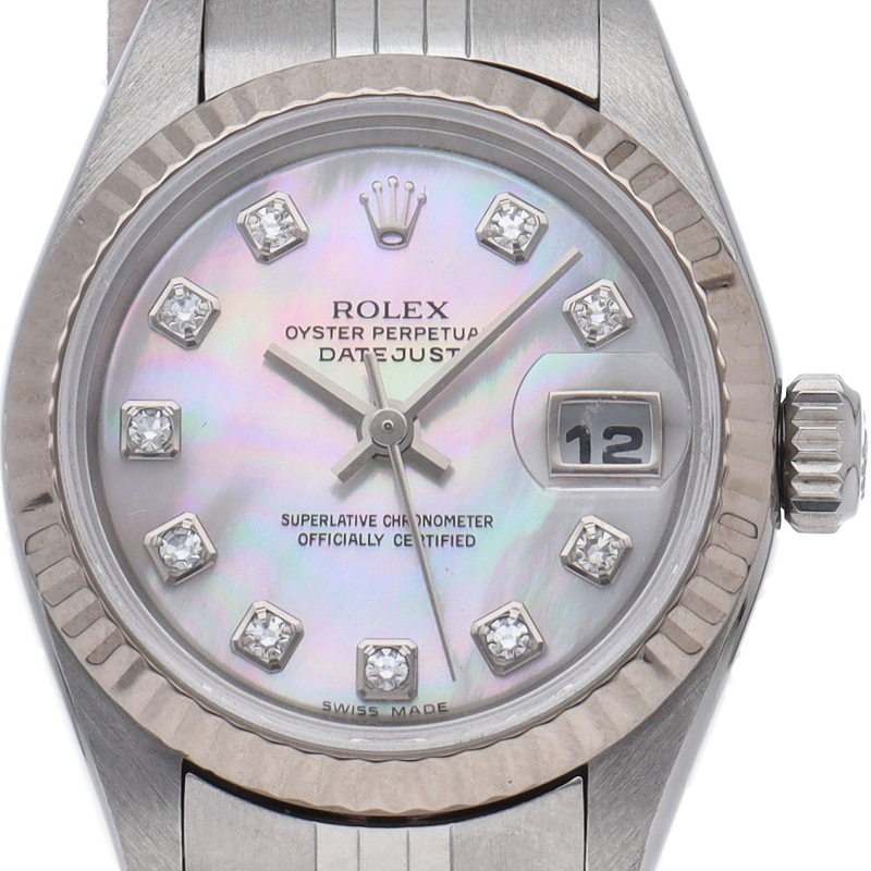 ロレックスのドレスウォッチで幅広い年齢層に愛されているデイトジャスト。ホワイトゴールドとステンレスのコンビ仕様に10Pダイヤが施され豪華です。