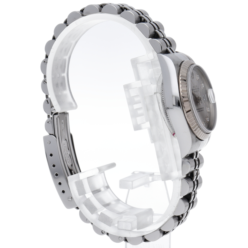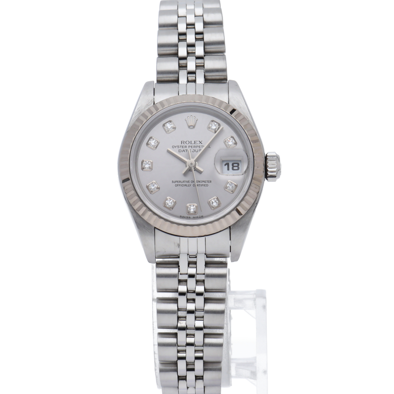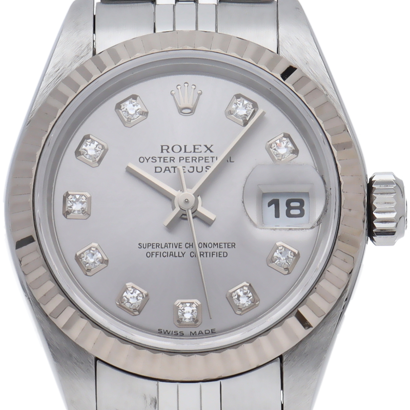 ロレックスのドレスウォッチで幅広い年齢層に愛されているデイトジャスト。ホワイトゴールドとステンレスのコンビ仕様に10Pダイヤが施され豪華です。