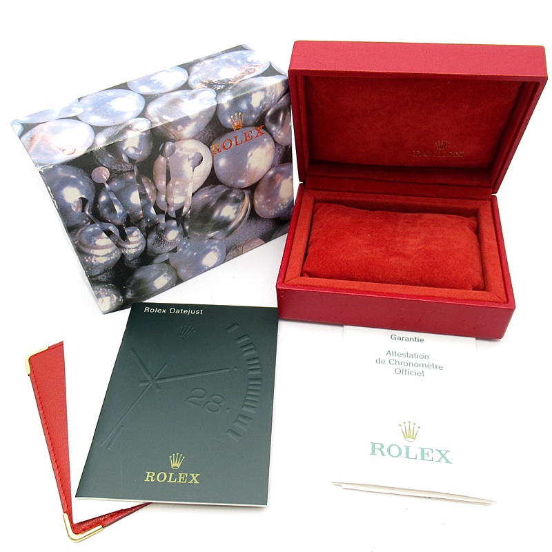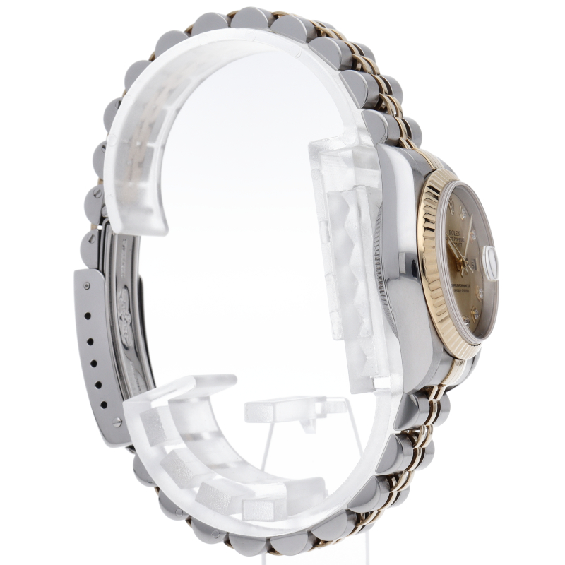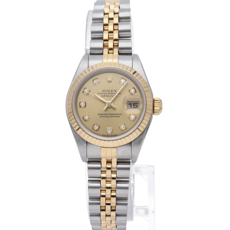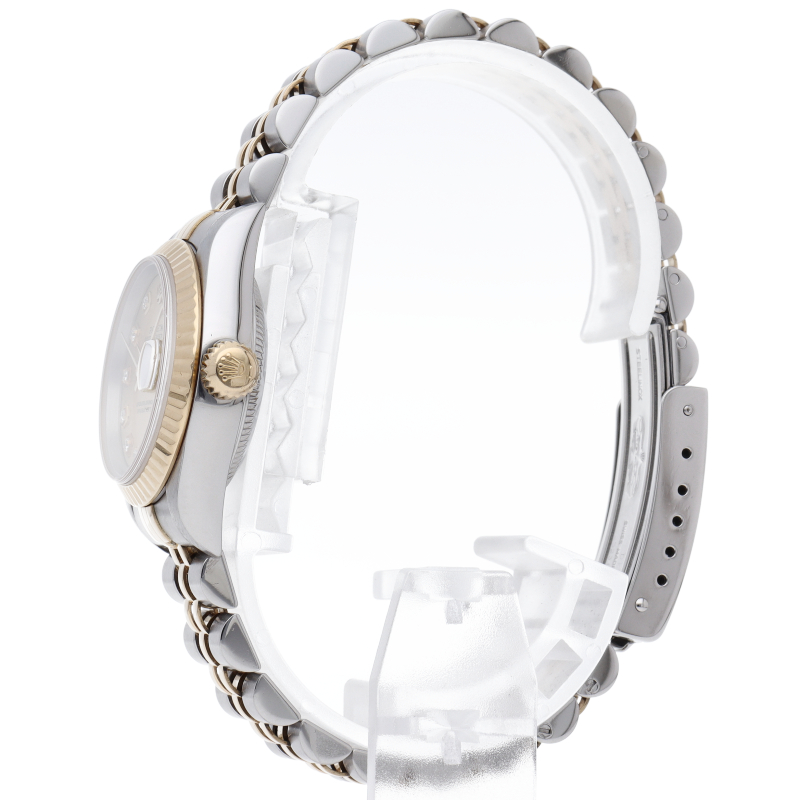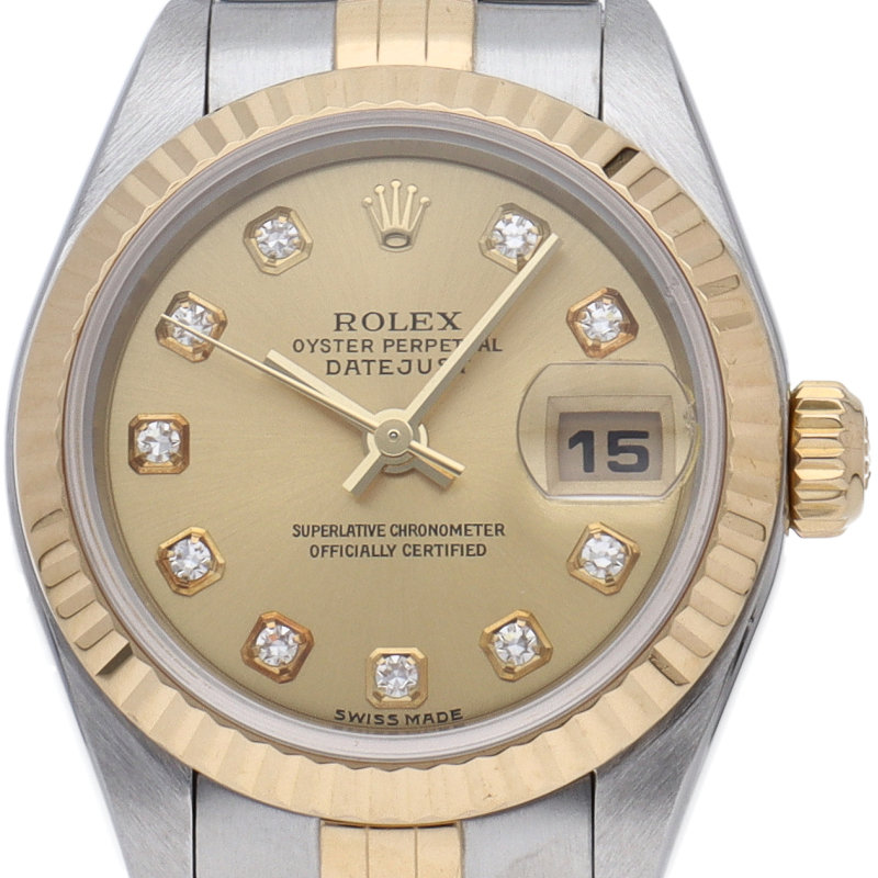 ロレックスのドレスウォッチで幅広い年齢層に愛されている「デイトジャスト」。イエローゴールドとステンレスのコンビ仕様に10Pダイヤが施され豪華です。