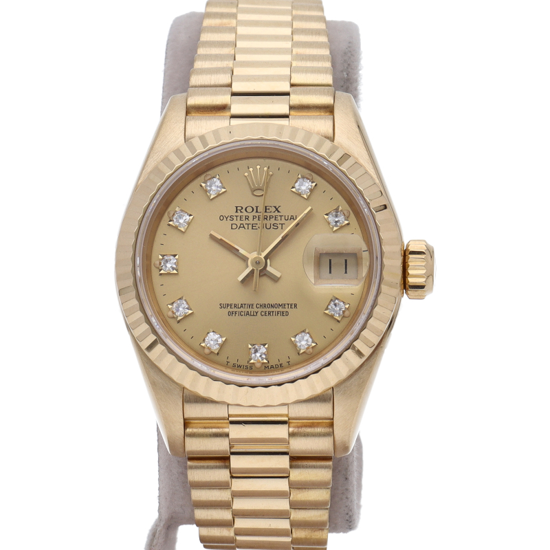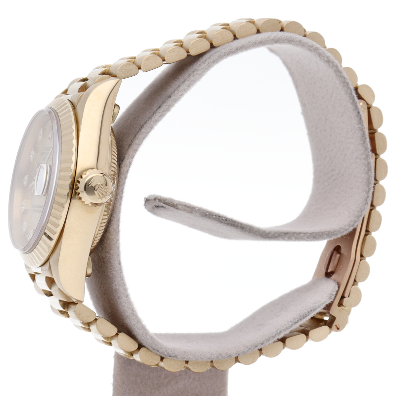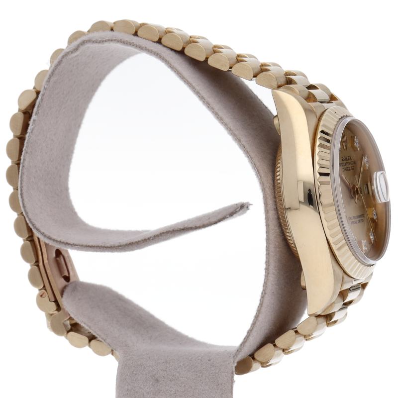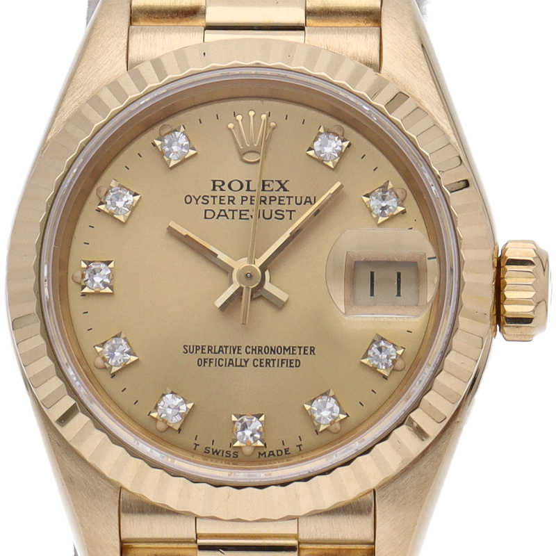 ロレックスのドレスウォッチで幅広い年齢層に愛されているデイトジャスト。イエローゴールドのケース、シャンパン文字盤に10Pダイヤが施され豪華です。
