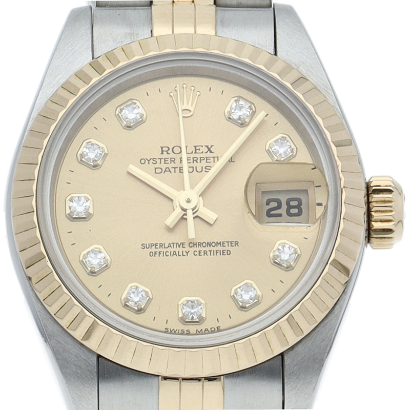 ロレックスの人気ドレスウォッチで幅広年齢層に人気のデイトジャスト。イエローゴールドとステンレスのコンビ仕様に10Pダイヤが施されてます。