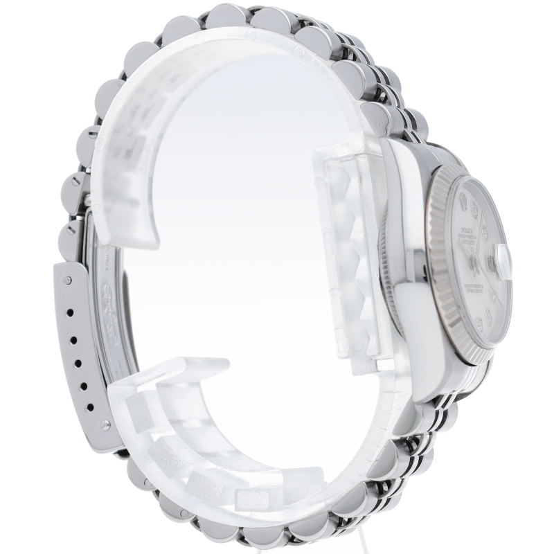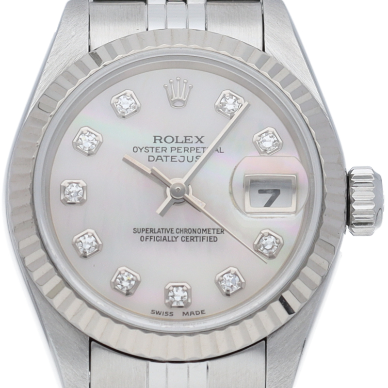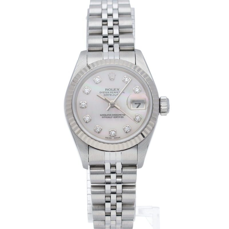 ロレックスの人気ドレスウォッチで幅広い年齢層に人気のデイトジャスト。ホワイトゴールドとステンレスの組み合わせが上品です。シェル文字盤と10Pダイヤが使用された上品なデザインです。