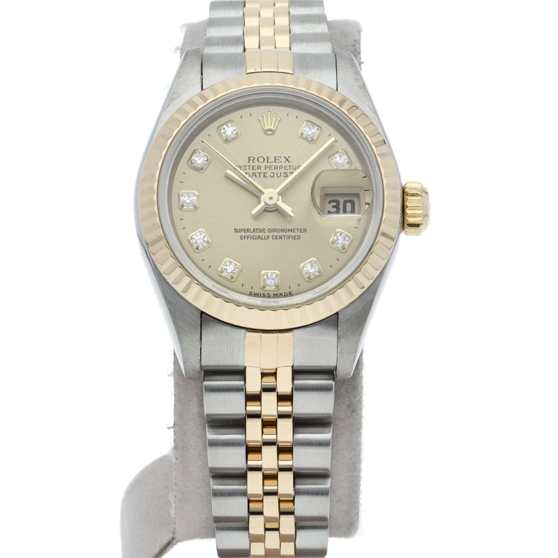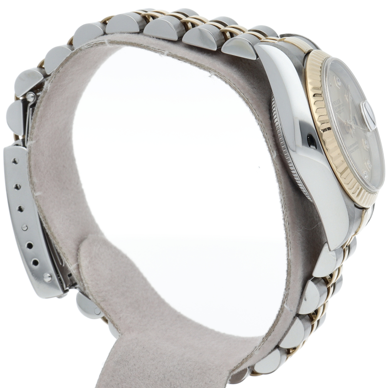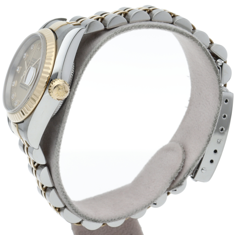 ロレックスの人気ドレスウォッチで幅広年齢層に人気のデイトジャスト。イエローゴールドとステンレスのコンビ仕様に10Pダイヤが施されてます。