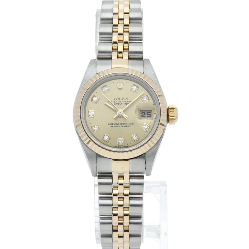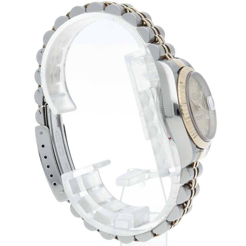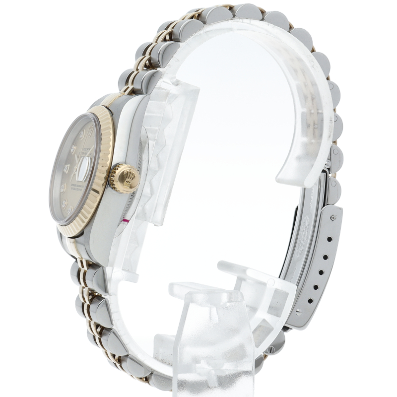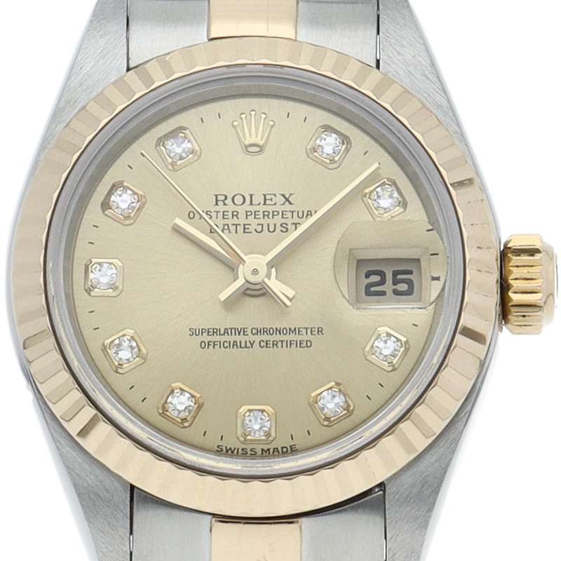 ロレックスのドレスウォッチで幅広い年齢層に愛されている「デイトジャスト」。イエローゴールドとステンレスのコンビ仕様に10Pダイヤが施され豪華です。