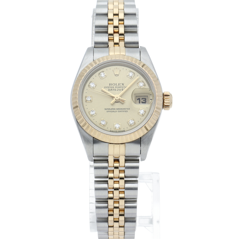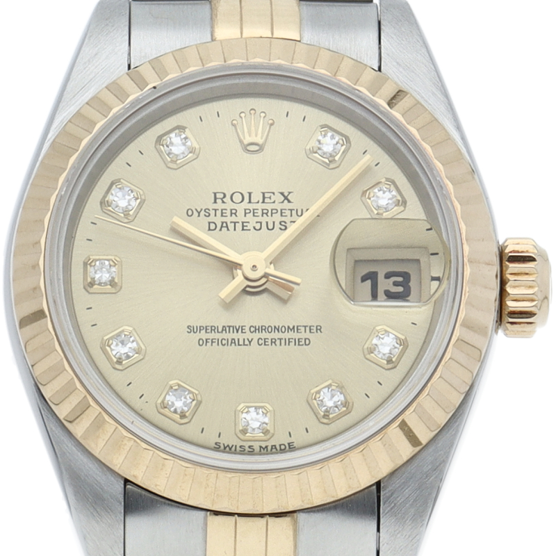 ロレックスの人気ドレスウォッチで幅広年齢層に人気のデイトジャスト。イエローゴールドとステンレスのコンビ仕様に10Pダイヤが施されてます。