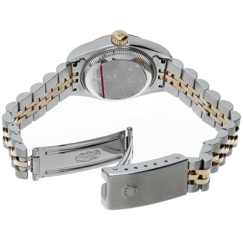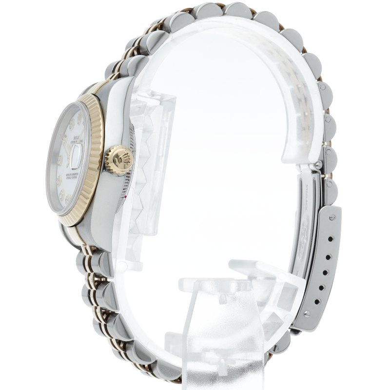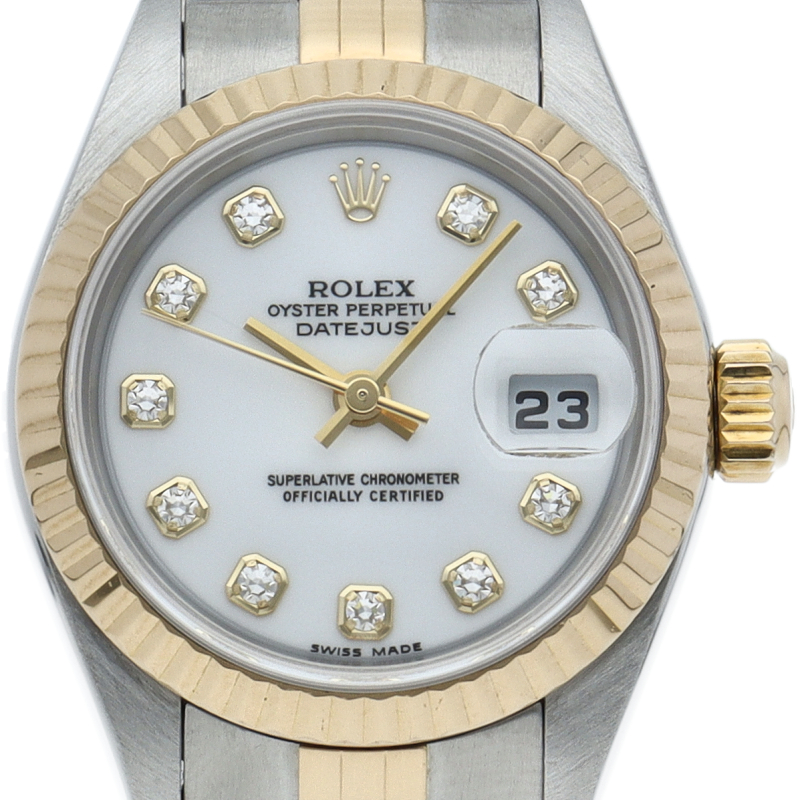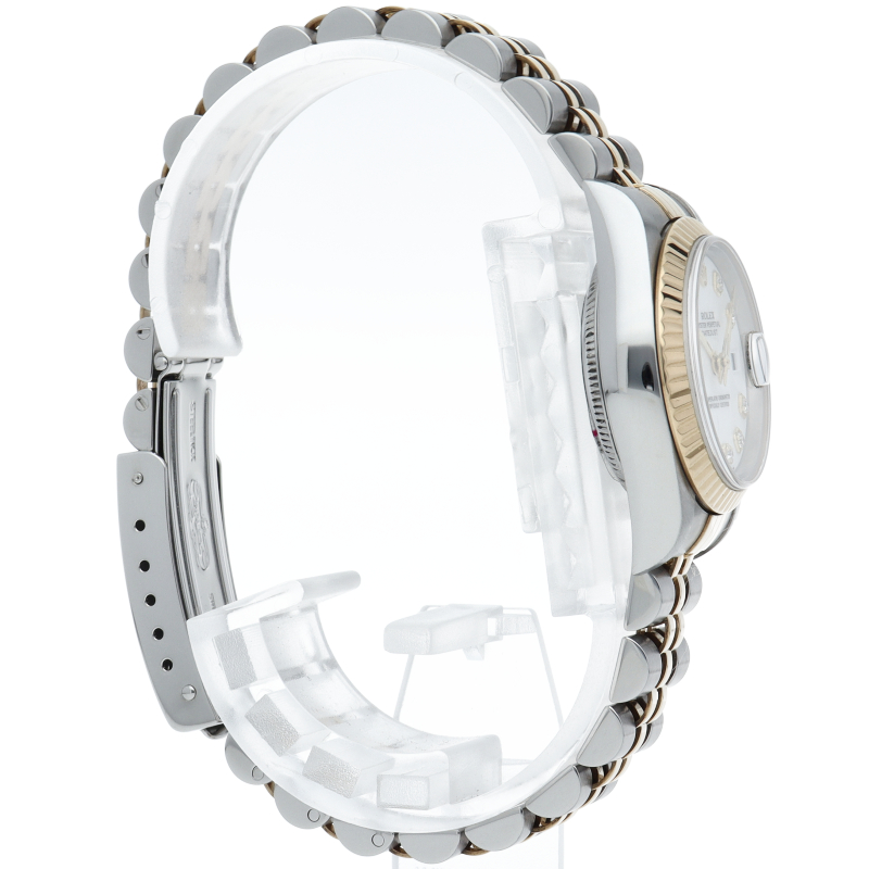 ロレックスのドレスウォッチで幅広い年齢層に愛されている「デイトジャスト」。イエローゴールドとステンレスのコンビ仕様に10Pダイヤが施され豪華です。