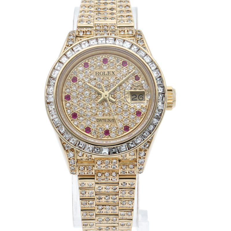 極美品。ブレスレットは伸びもなく良い状態です。ブレスレット、ベゼル、文字盤には後付でダイヤとルビーが施されております。海外購入品です。