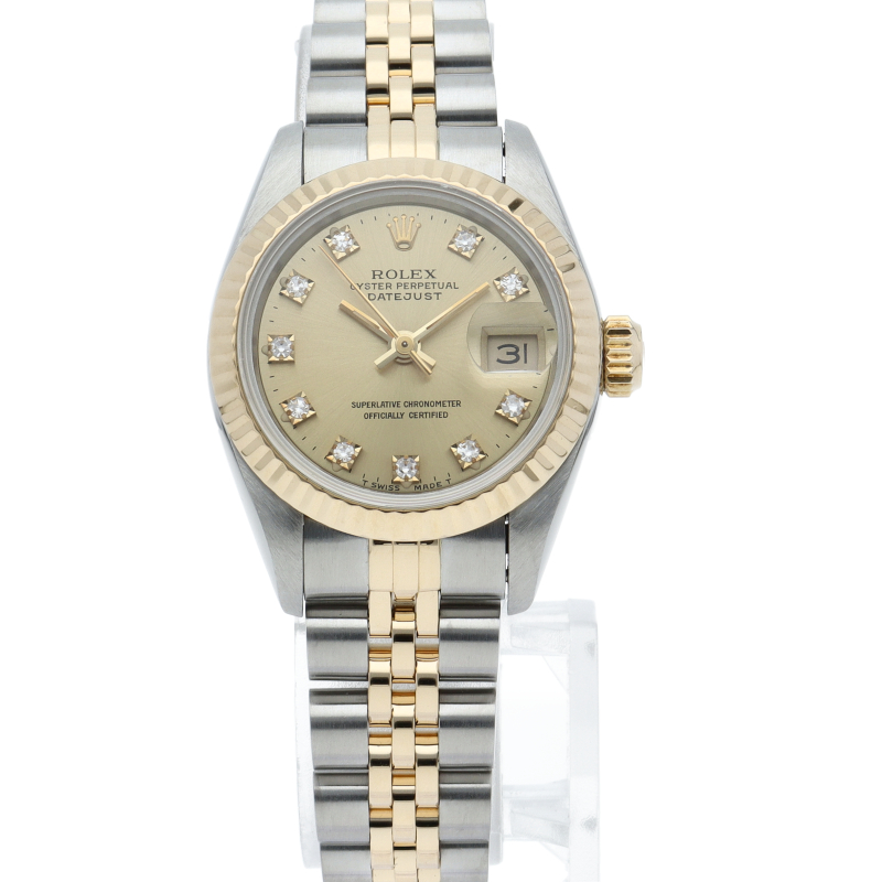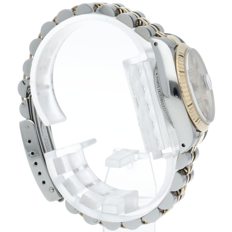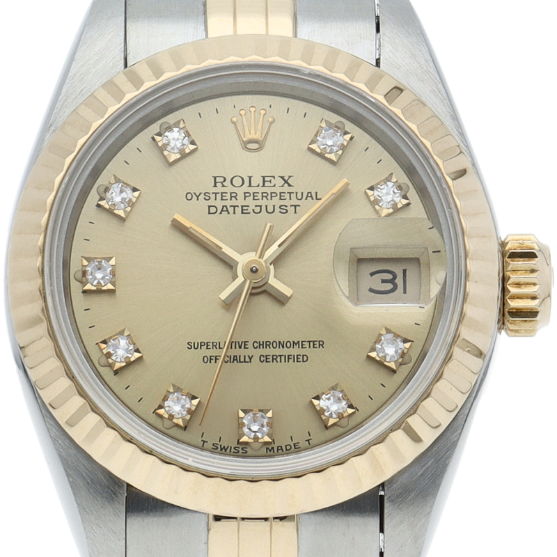 ロレックスの人気ドレスウォッチで幅広年齢層に人気のデイトジャスト。イエローゴールドとステンレスのコンビ仕様に10Pダイヤが施されてます。