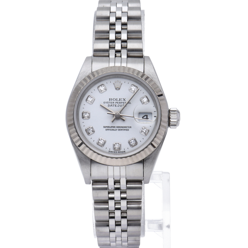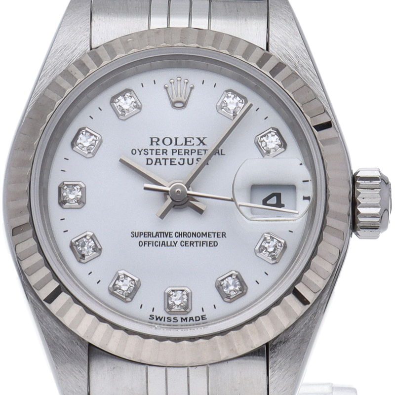ロレックスのドレスウォッチで幅広い年齢層に愛されているデイトジャスト。ホワイトゴールドとステンレスのコンビ仕様に10Pダイヤが施され豪華です。
