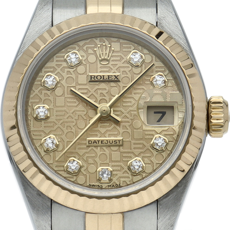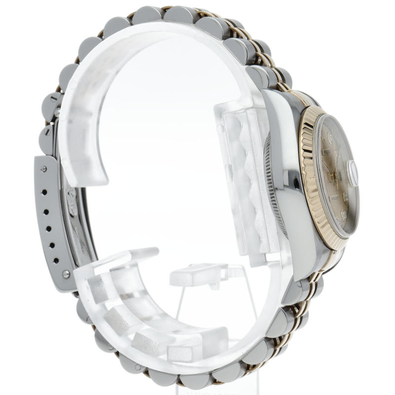 ロレックスのドレスウォッチで幅広い年齢層に愛されている「デイトジャスト」。イエローゴールドとステンレスのコンビ仕様に10Pダイヤが施され豪華です。