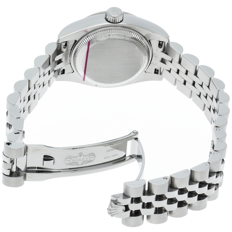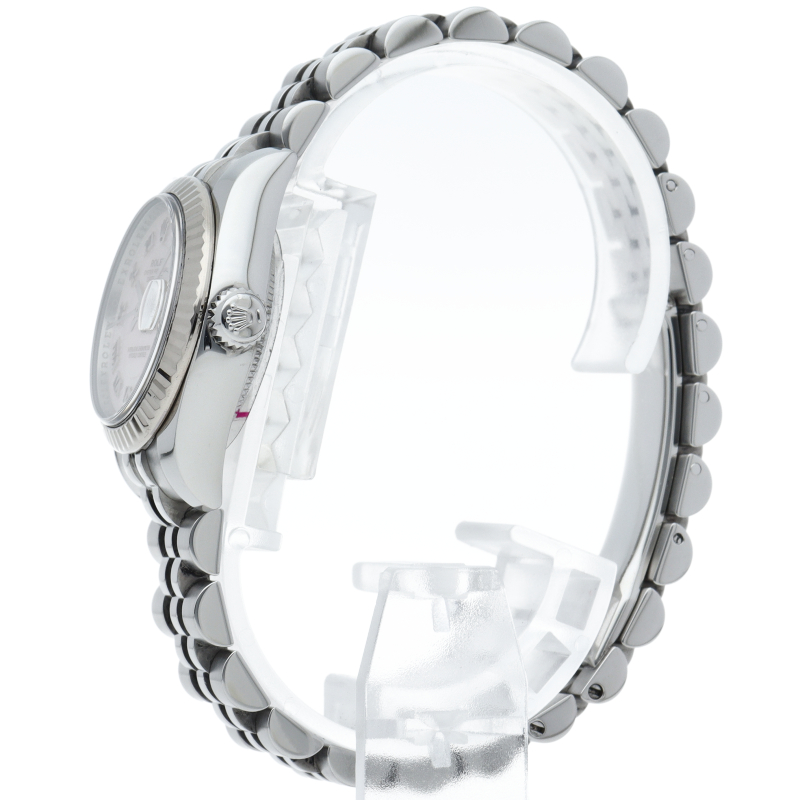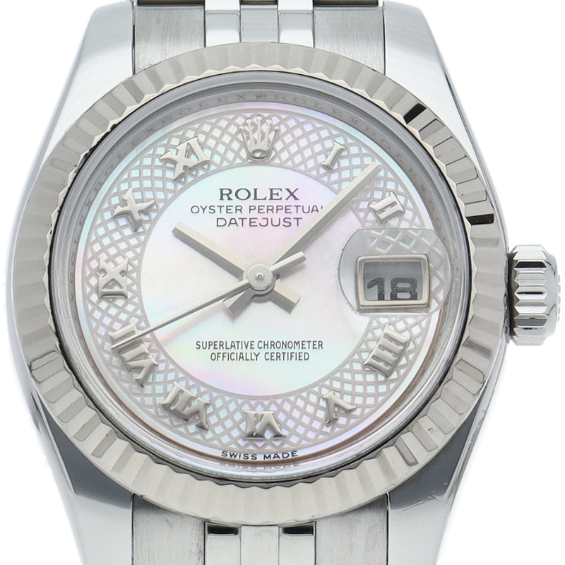男女問わず永遠のステータスシンボルとも言えるロレックスの“デイトジャスト”。様々なバリエーションがありますが、こちらは ピンクシェル文字盤にデコレーション(格子模様)を施した希少性の高いモデルです。ゴールドの光沢にも負けないピンクシェルの柔らかな光沢感が魅力です。