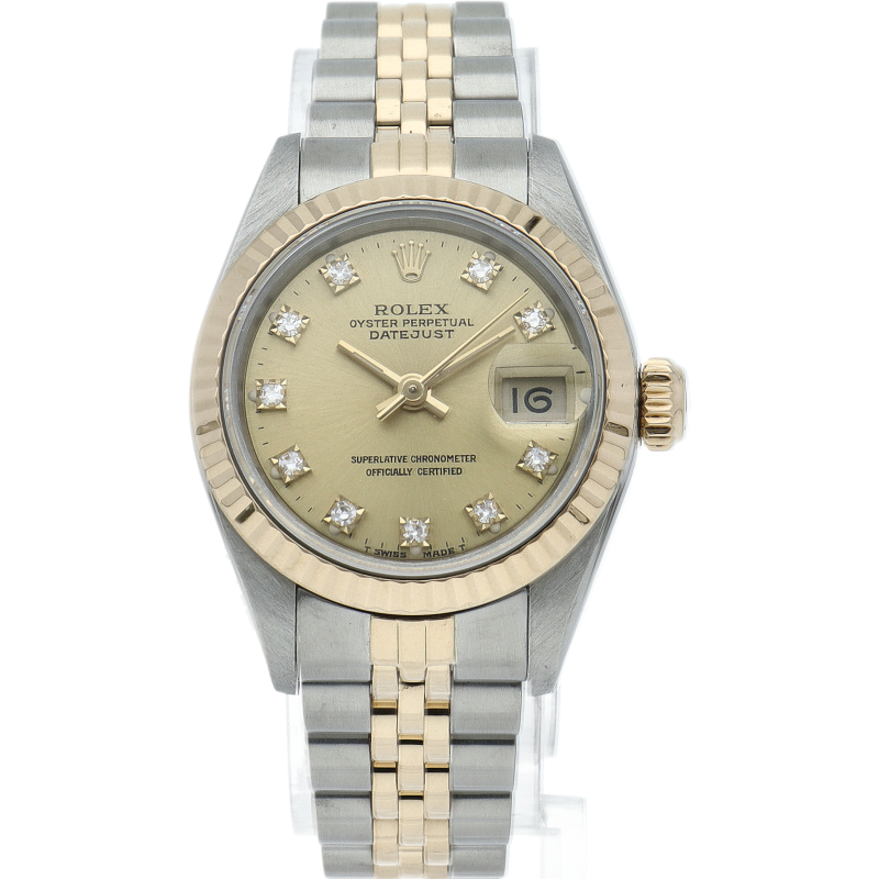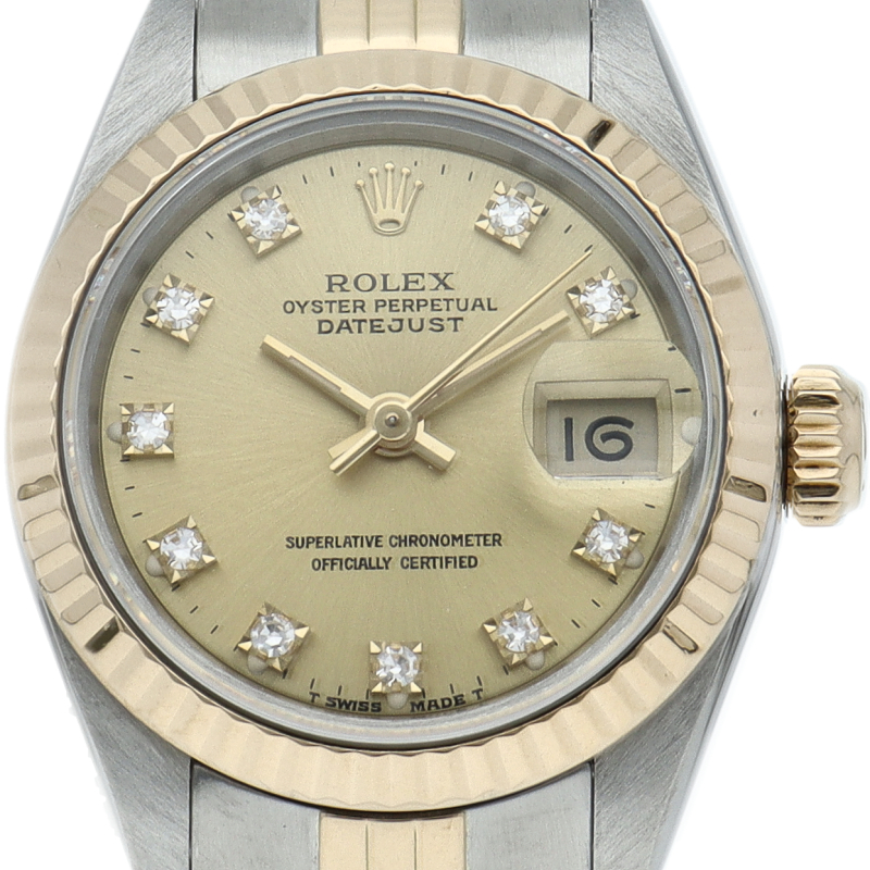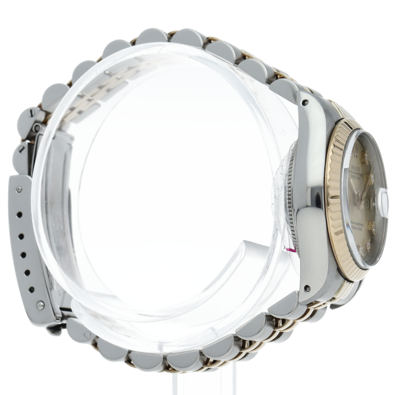 ロレックスの人気ドレスウォッチで幅広年齢層に人気のデイトジャスト。イエローゴールドとステンレスのコンビ仕様に10Pダイヤが施されてます。
