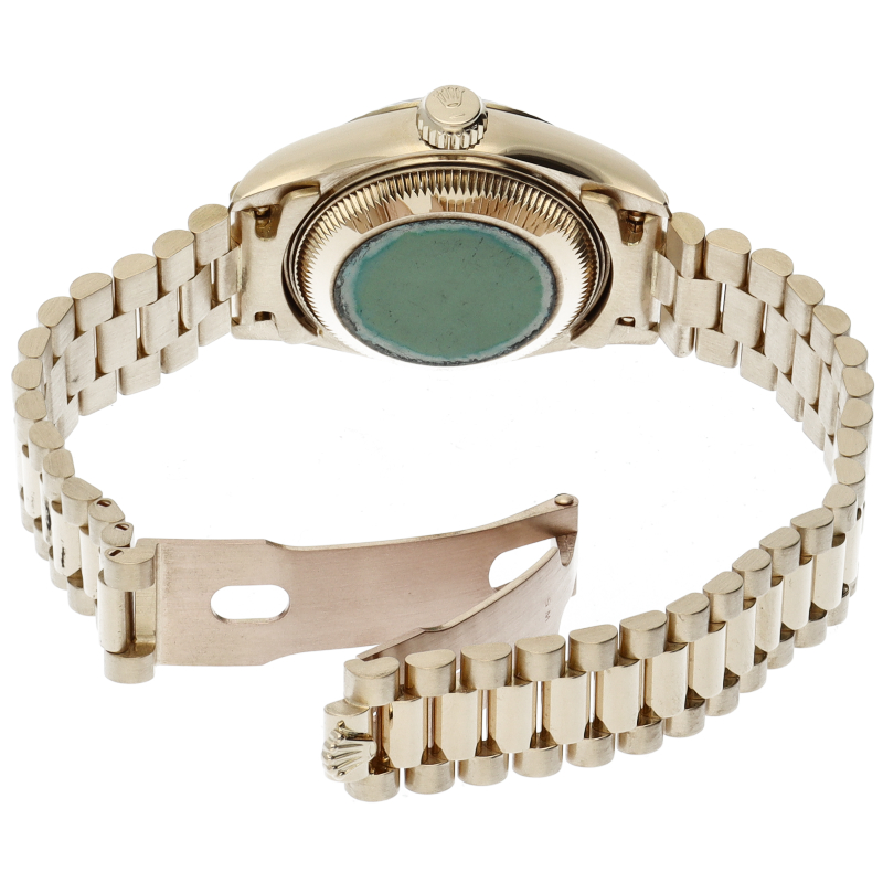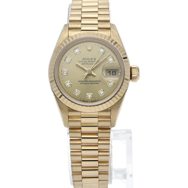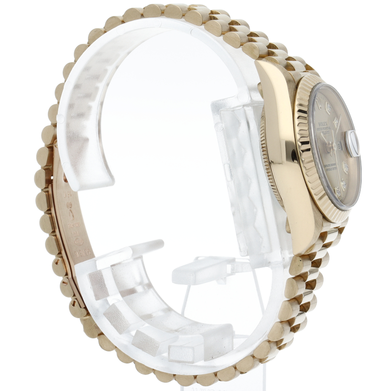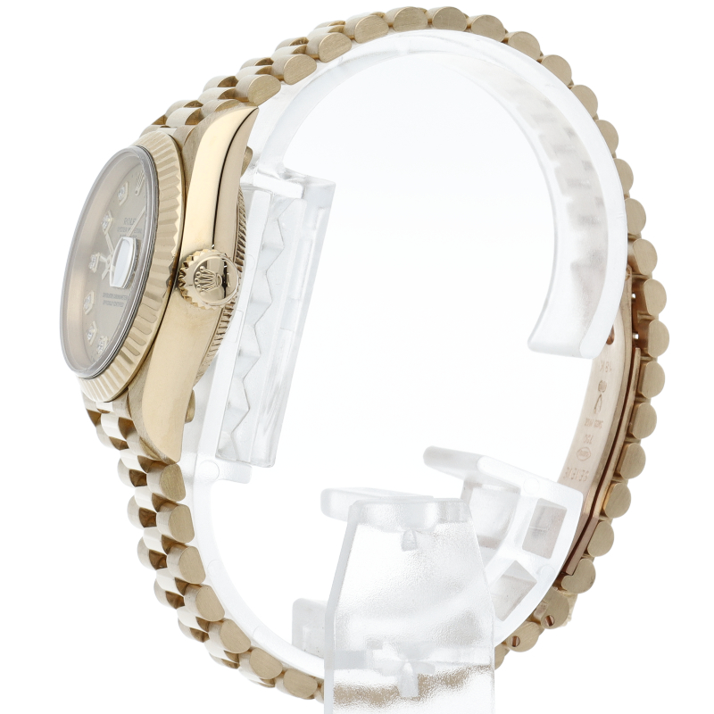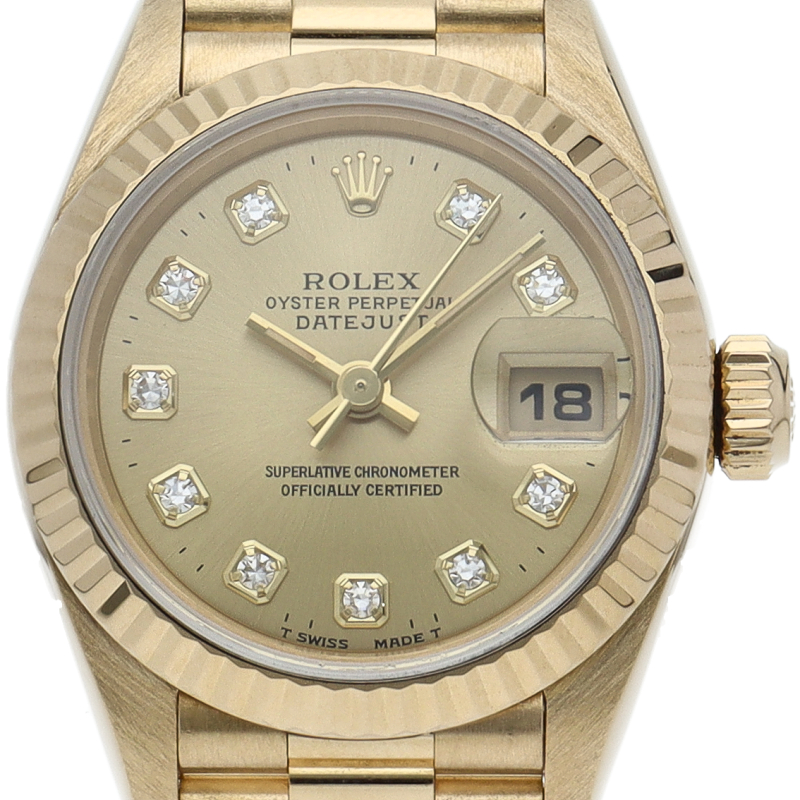 ロレックスのドレスウォッチで幅広い年齢層に愛されているデイトジャスト。イエローゴールドのケース、シャンパン文字盤に10Pダイヤが施され豪華です。