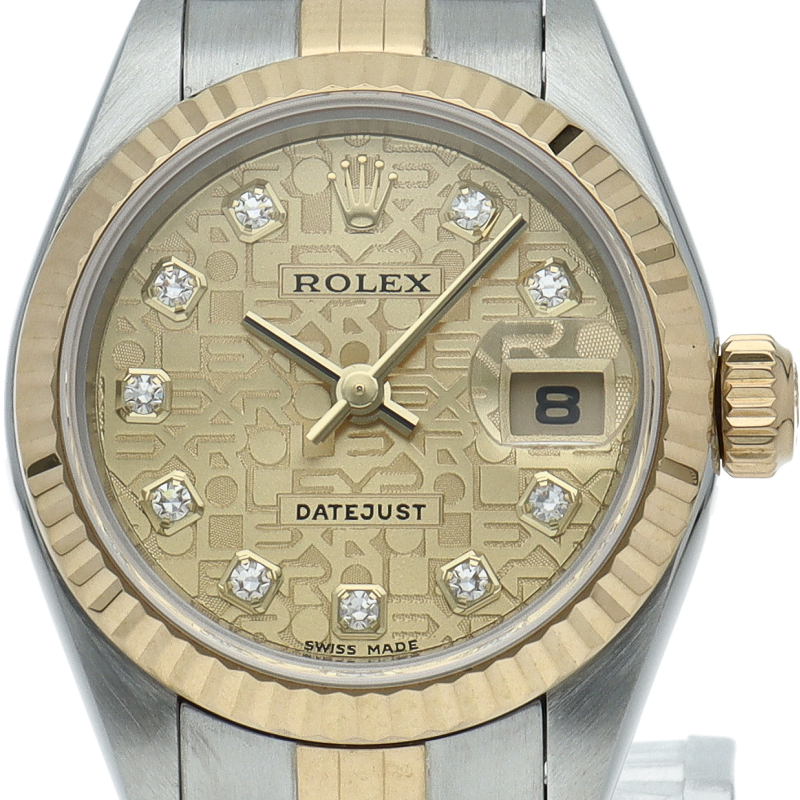 ロレックスのドレスウォッチで幅広い年齢層に愛されている「デイトジャスト」。イエローゴールドとステンレスのコンビ仕様に10Pダイヤが施され豪華です。