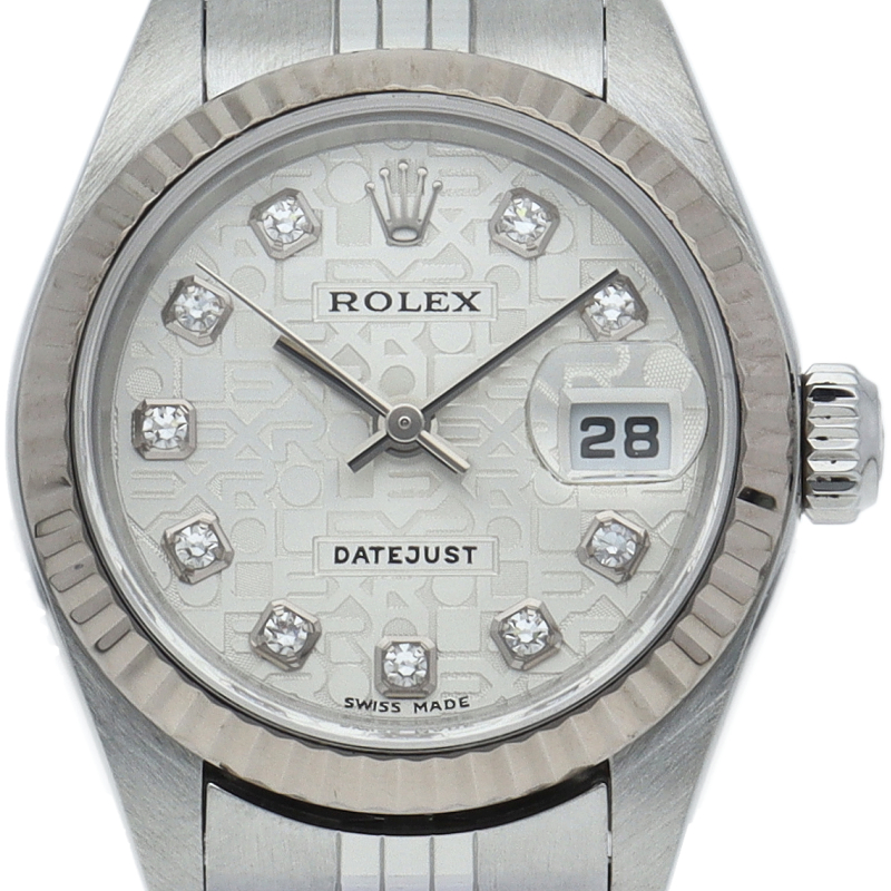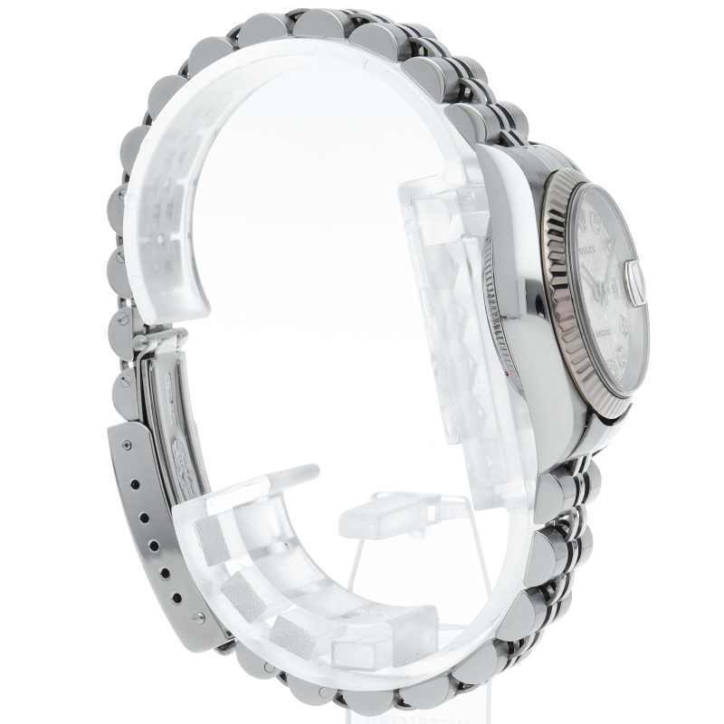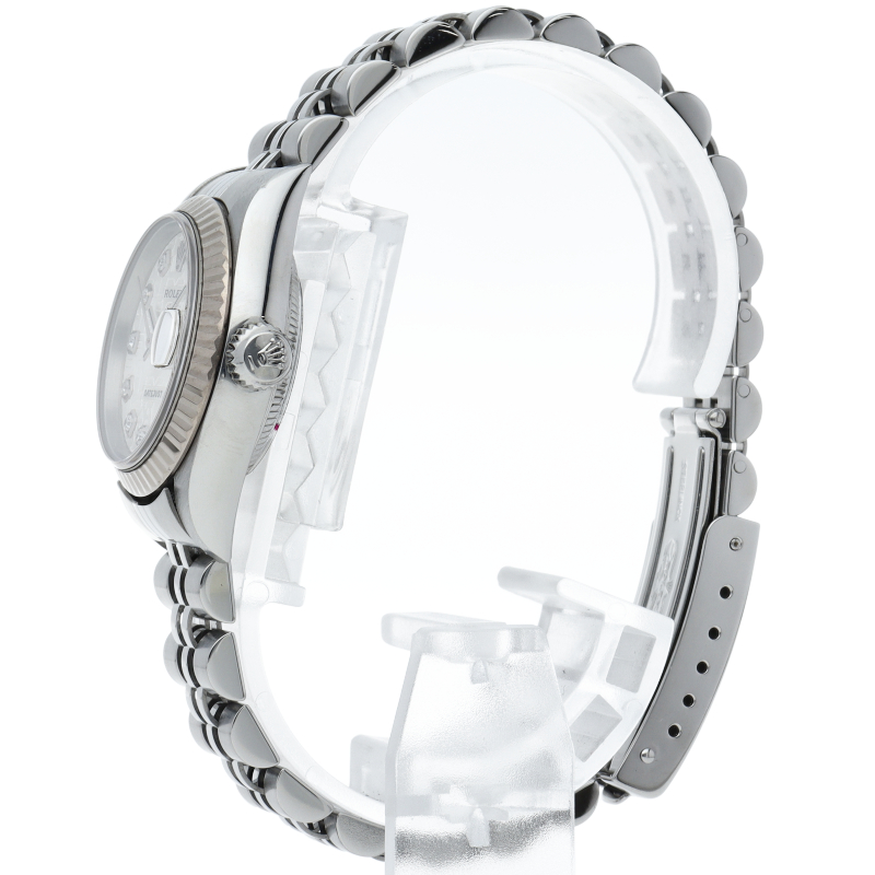 2000年頃の個体で、癖のないステンレスケースにホワイトゴールド製のフルーテッドベゼルを備えることで、文字盤とダイヤをより高貴な印象に。ダイヤが派手に感じる方もいらっしゃると思いますが、レディースの小ぶりなケースから放たれるダイヤの輝きには嫌味な印象は無く、程良いアクセントになっております。ケース径は26mmと女性の腕元にスッキリと納まり、洗練された大人の雰囲気を演出できると思います。