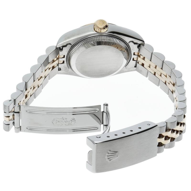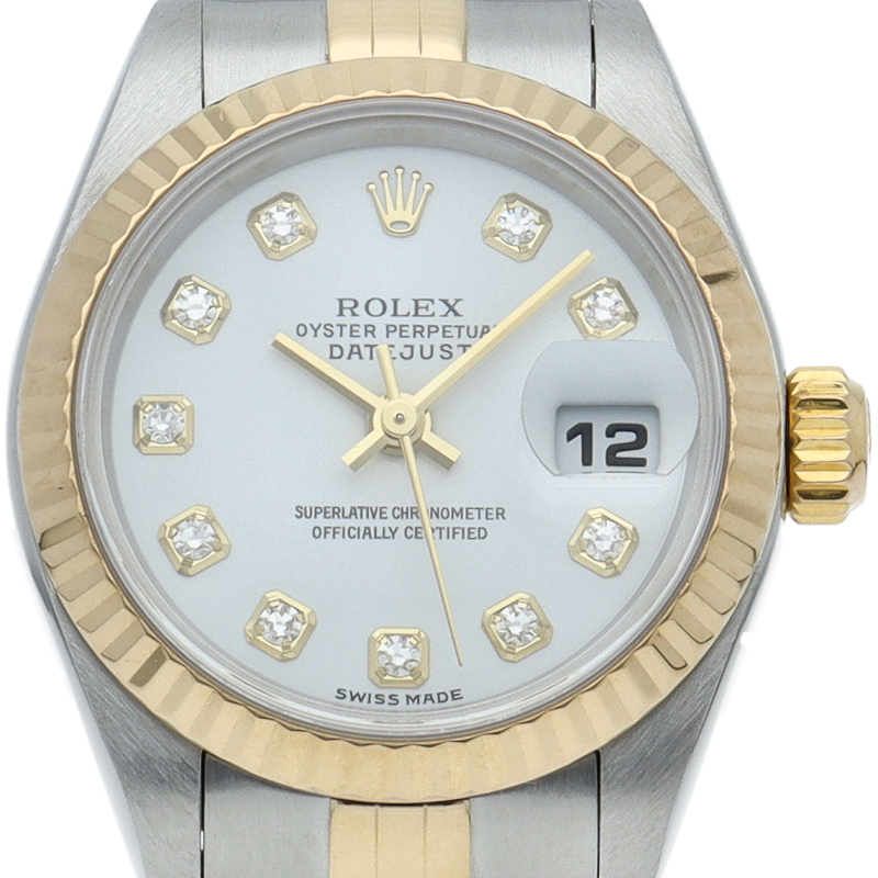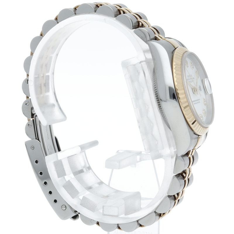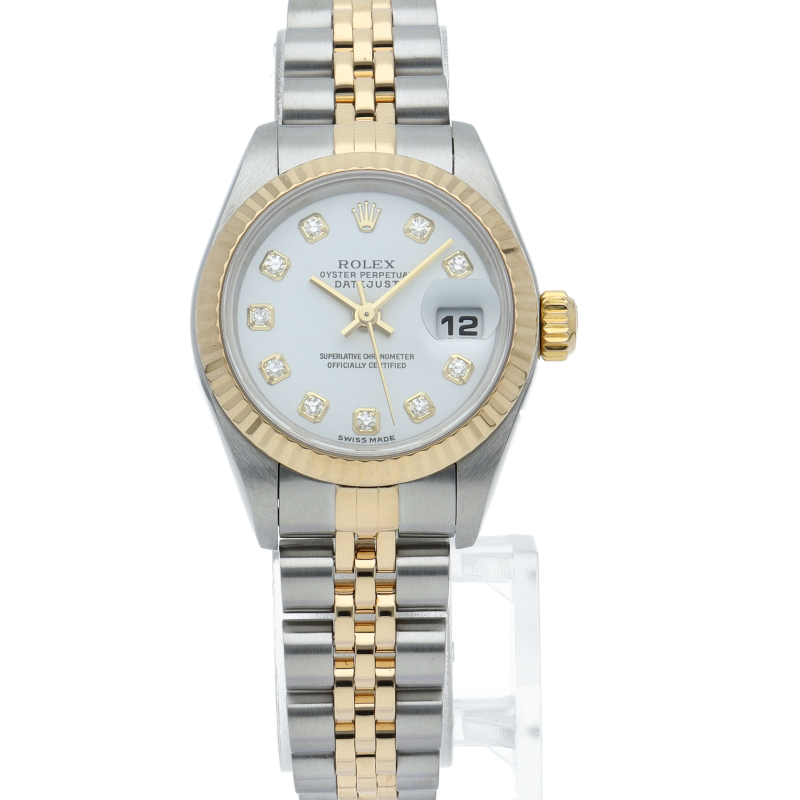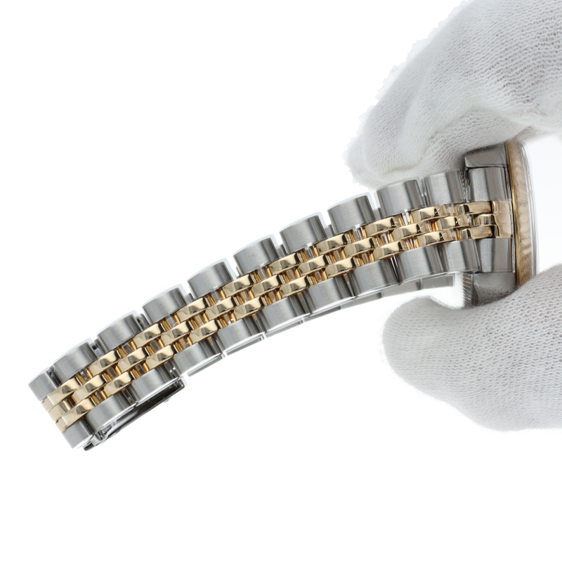 ロレックスのドレスウォッチで幅広い年齢層に愛されている「デイトジャスト」。イエローゴールドとステンレスのコンビ仕様に10Pダイヤが施され豪華です。