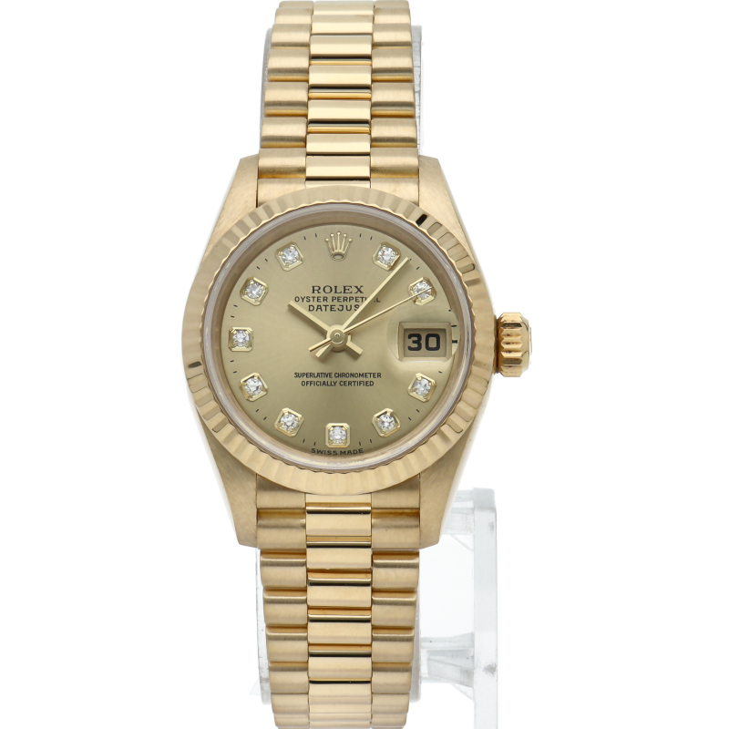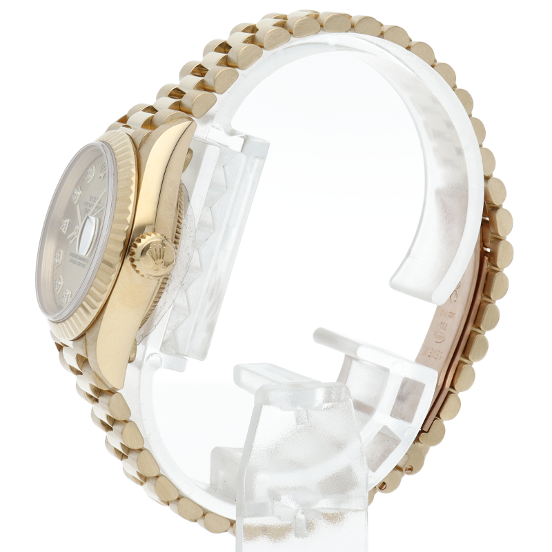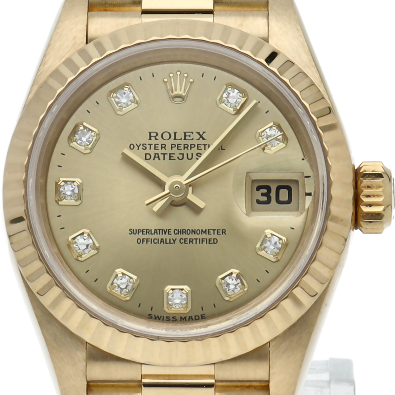 ロレックスのドレスウォッチで幅広い年齢層に愛されているデイトジャスト。イエローゴールドのケース、シャンパン文字盤に10Pダイヤが施され豪華です。