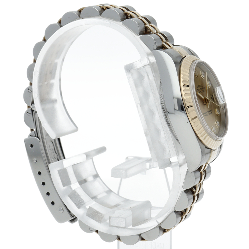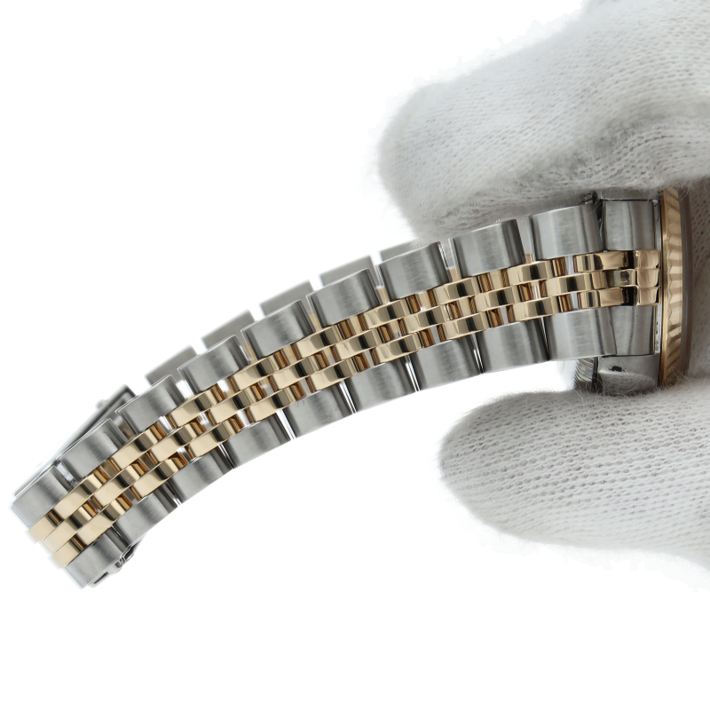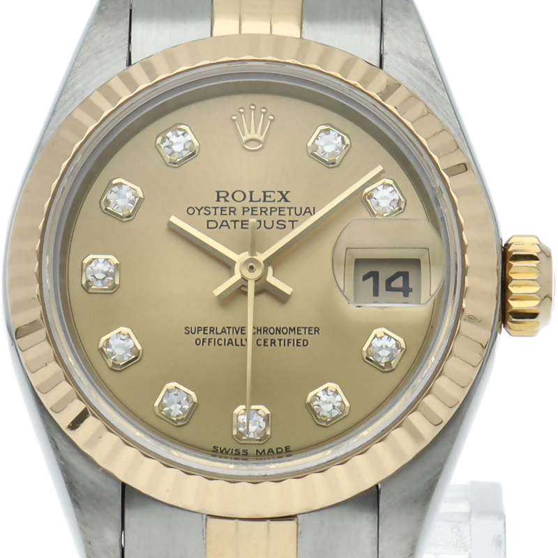 ロレックスのドレスウォッチで幅広い年齢層に愛されている「デイトジャスト」。イエローゴールドとステンレスのコンビ仕様に10Pダイヤが施され豪華です。
