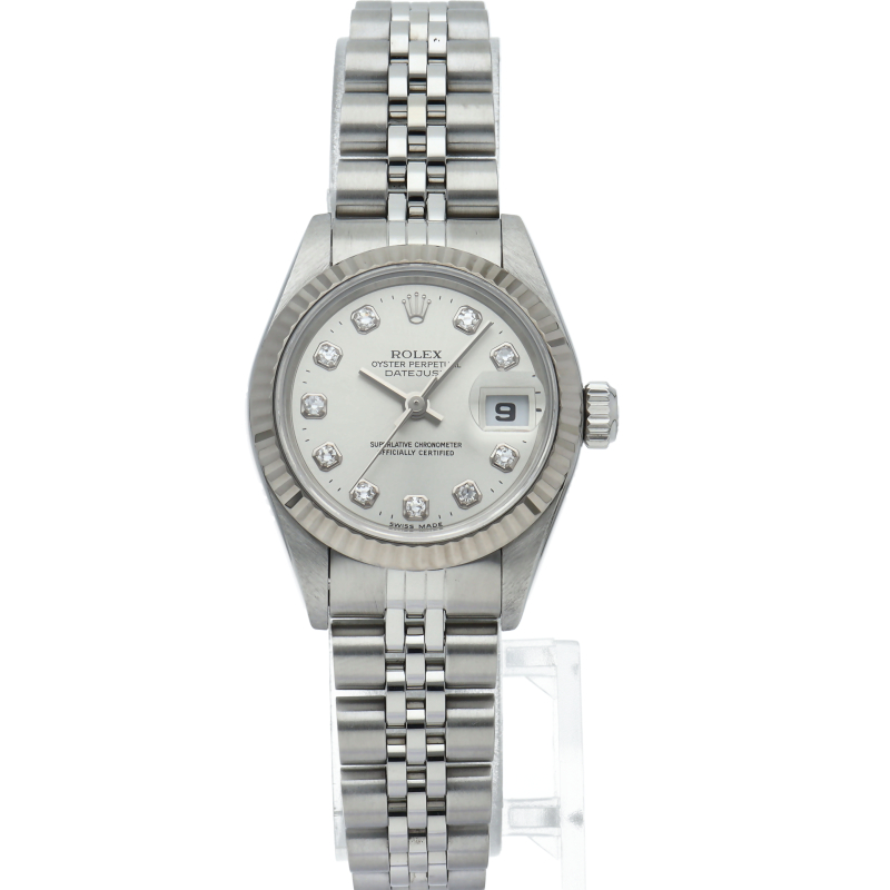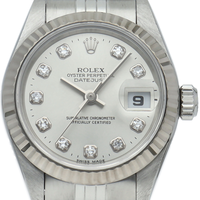 ロレックスのドレスウォッチで幅広い年齢層に愛されているデイトジャスト。ホワイトゴールドとステンレスのコンビ仕様に10Pダイヤが施され豪華です。