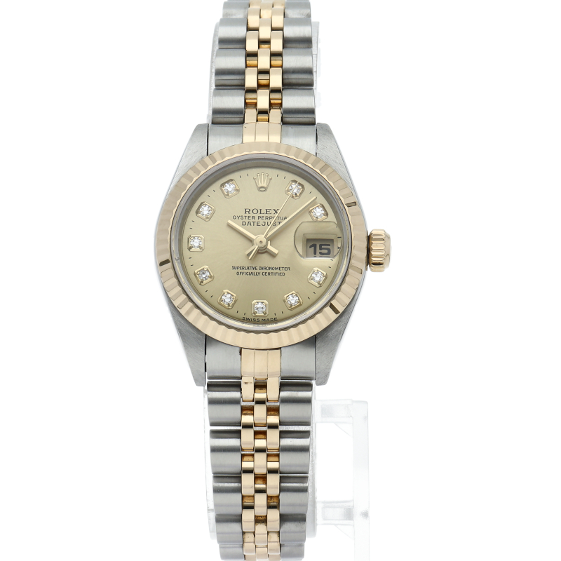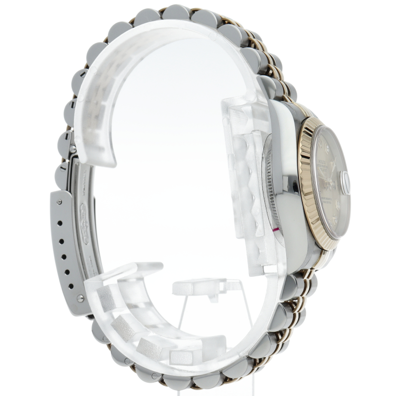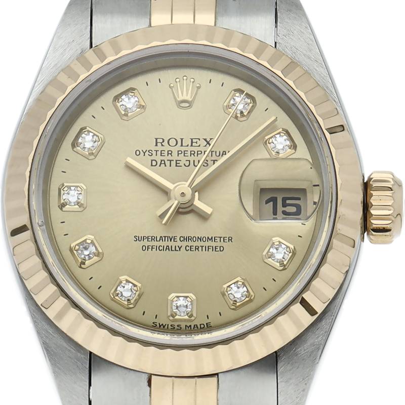 ロレックスのドレスウォッチで幅広い年齢層に愛されている「デイトジャスト」。イエローゴールドとステンレスのコンビ仕様に10Pダイヤが施され豪華です。