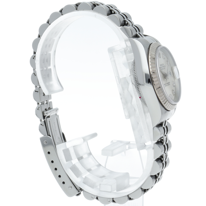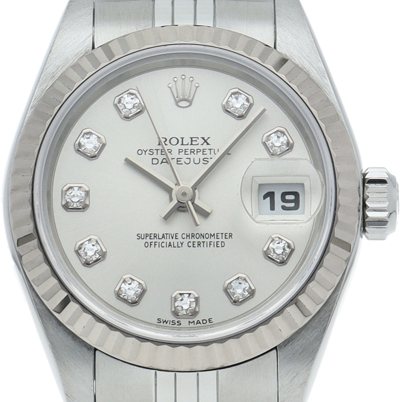 ロレックスのドレスウォッチで幅広い年齢層に愛されているデイトジャスト。ホワイトゴールドとステンレスのコンビ仕様に10Pダイヤが施され豪華です。