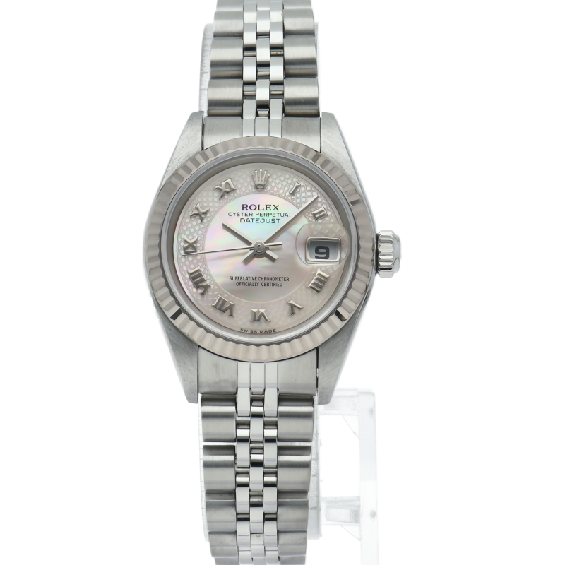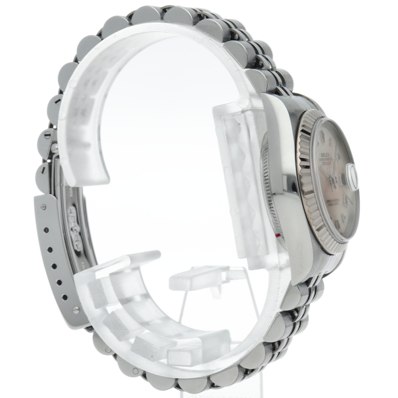 男女問わず永遠のステータスシンボルとも言えるロレックスの“デイトジャスト”。様々なバリエーションがありますが、こちらは ピンクシェル文字盤にデコレーション(格子模様)を施した希少性の高いモデルです。ゴールドの光沢にも負けないピンクシェルの柔らかな光沢感が魅力です。