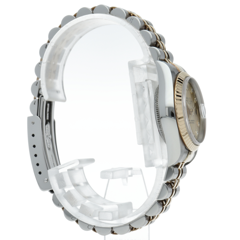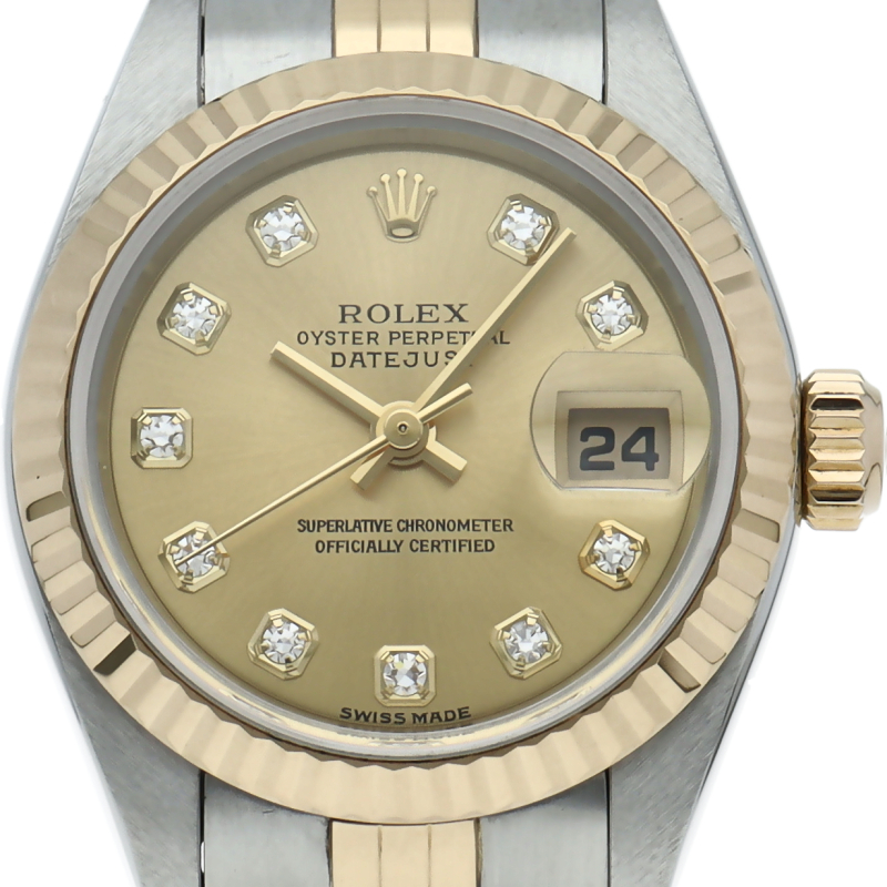 ロレックスのドレスウォッチで幅広い年齢層に愛されている「デイトジャスト」。イエローゴールドとステンレスのコンビ仕様に10Pダイヤが施され豪華です。