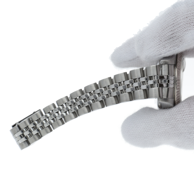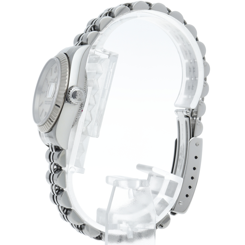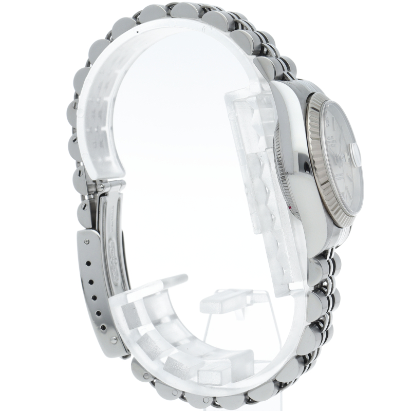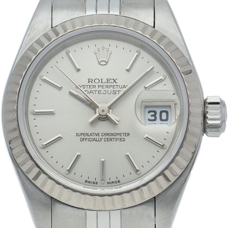 ロレックスのレディースモデル不動の定番「デイトジャスト」Ref.79174。18Kホワイトゴールドベゼルの清楚な輝きが、手元を上品に彩ります。現行より華奢なラグと軽量なブレスレットは、アクセサリー感覚で着けられる快適な装着感が魅力。信頼性の高いCal.2235を搭載し、流行に左右されない永遠のスタンダードです。