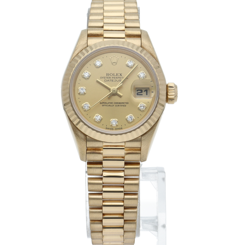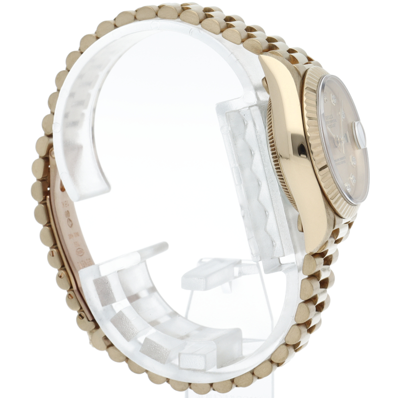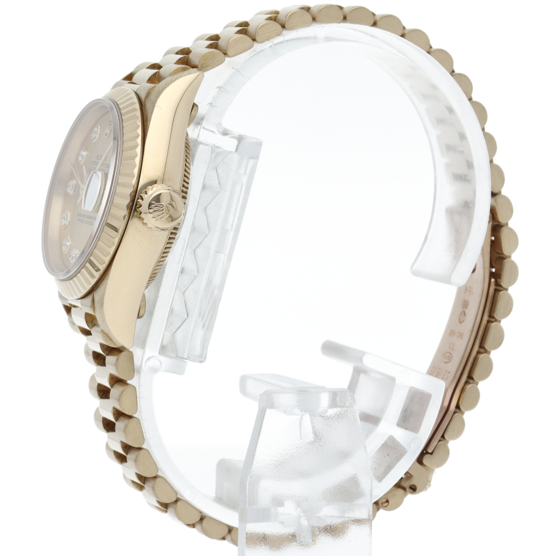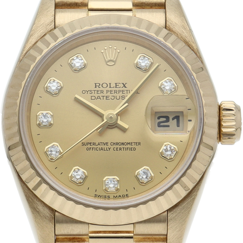 ロレックスのドレスウォッチで幅広い年齢層に愛されているデイトジャスト。イエローゴールドのケース、シャンパン文字盤に10Pダイヤが施され豪華です。