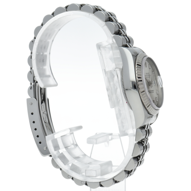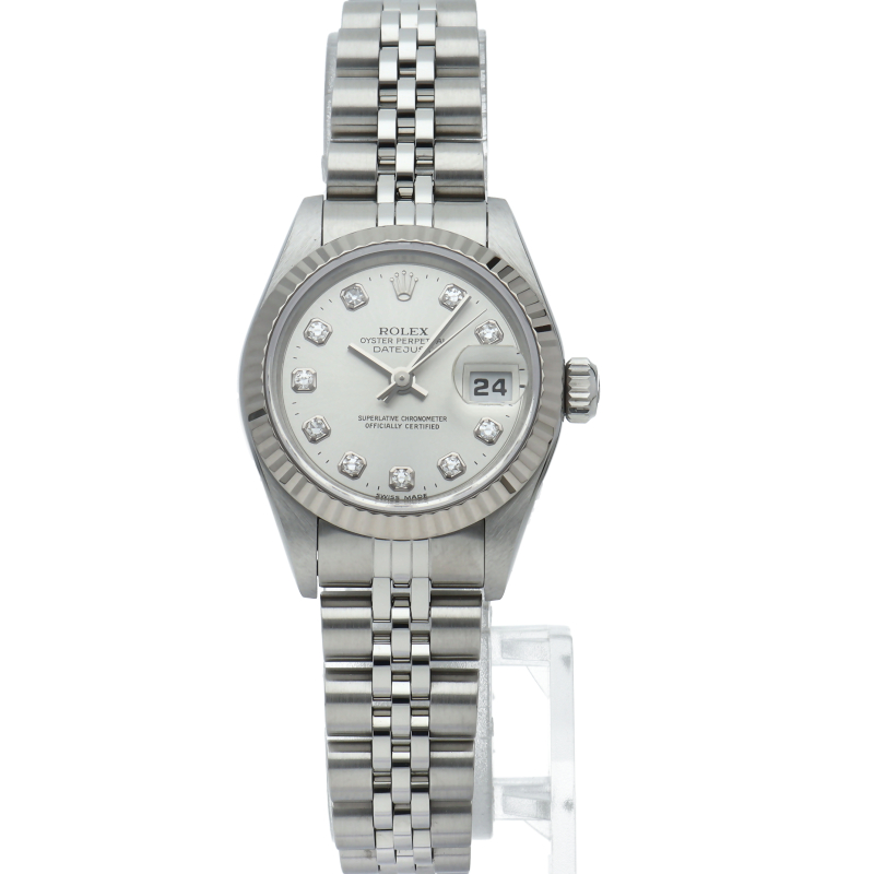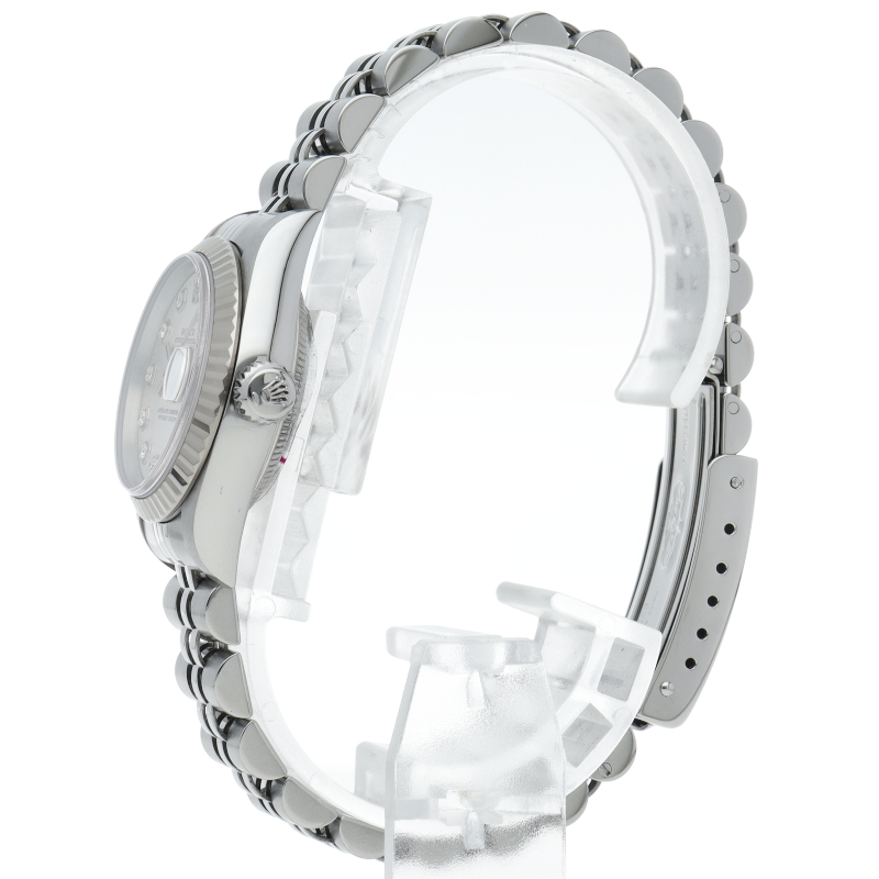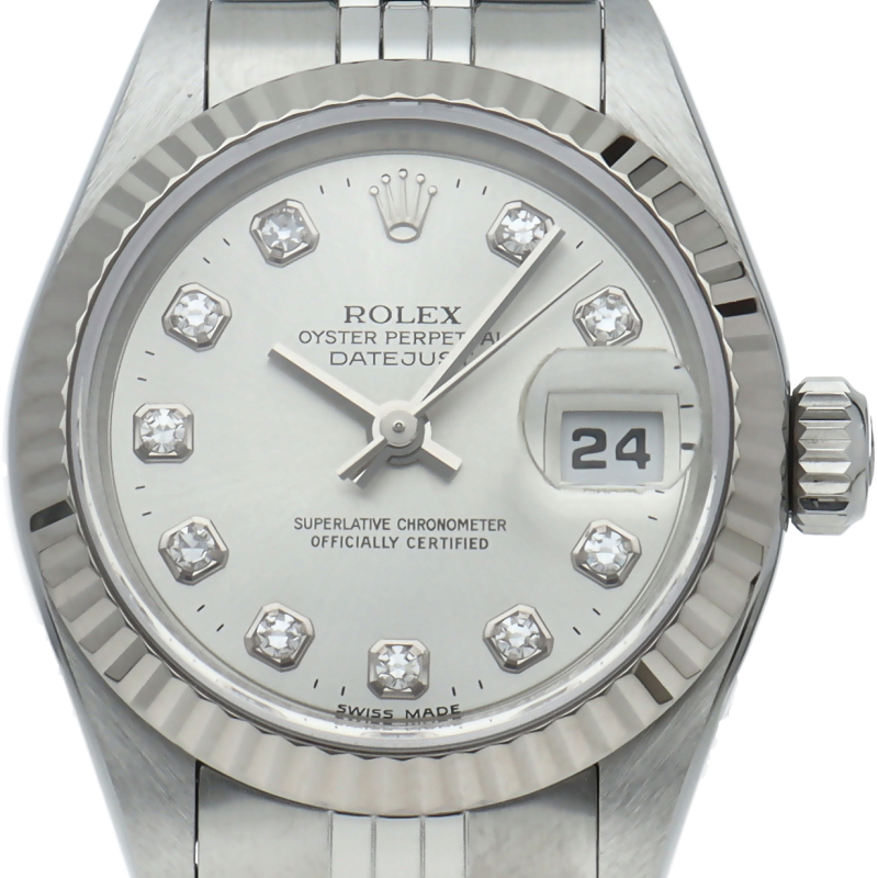 ロレックスのドレスウォッチで幅広い年齢層に愛されているデイトジャスト。ホワイトゴールドとステンレスのコンビ仕様に10Pダイヤが施され豪華です。