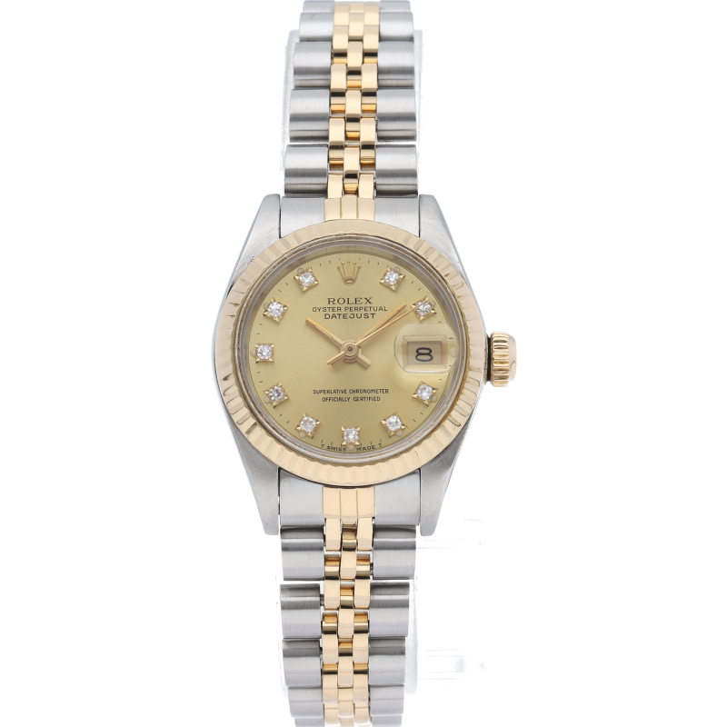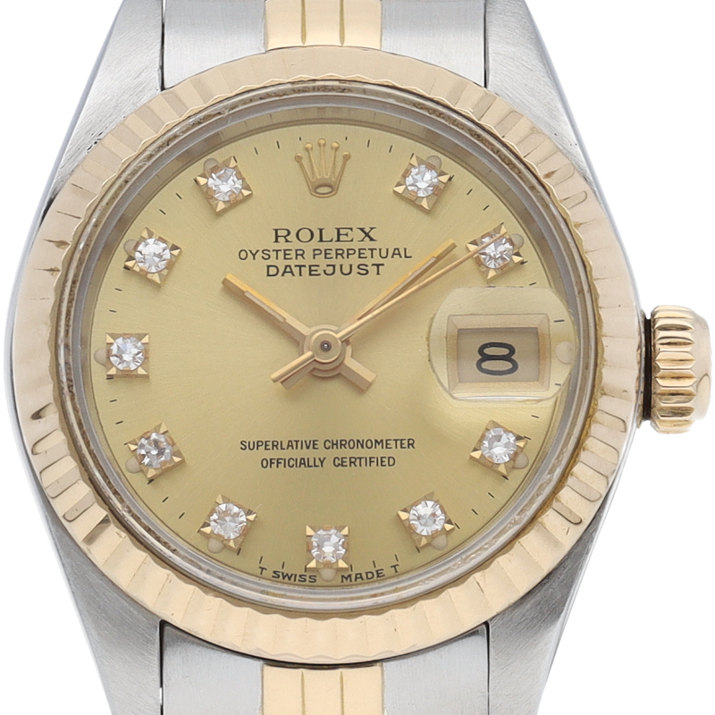 ロレックスの人気ドレスウォッチで幅広年齢層に人気のデイトジャスト。イエローゴールドとステンレスのコンビ仕様に10Pダイヤが施されてます。