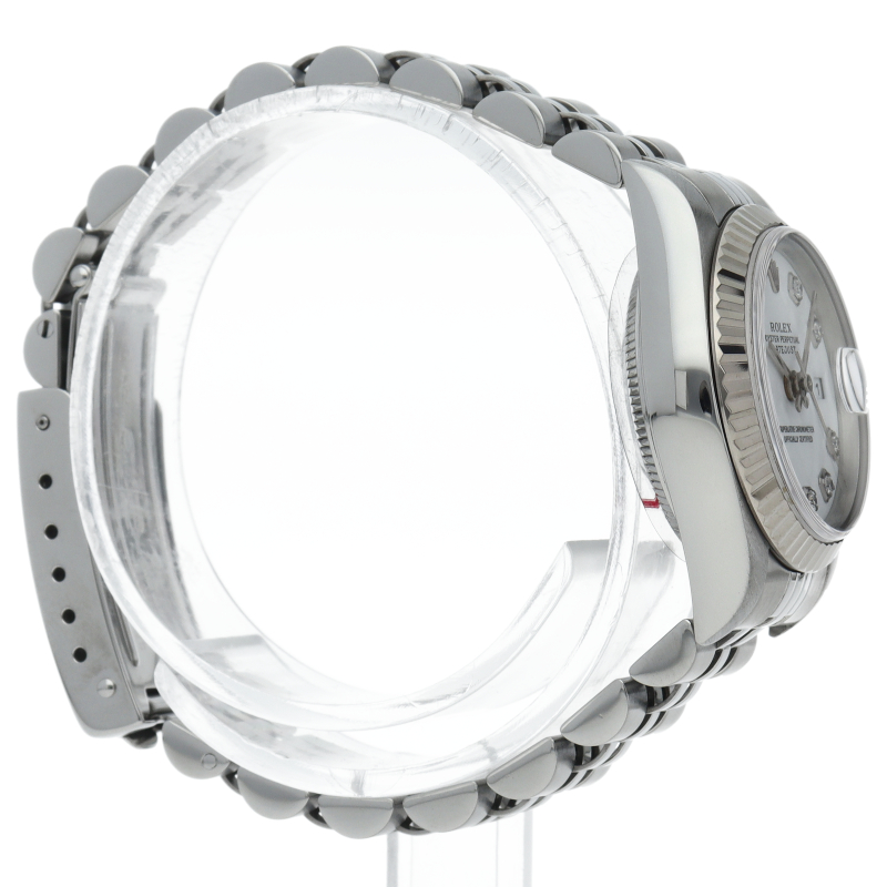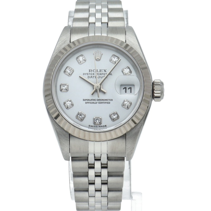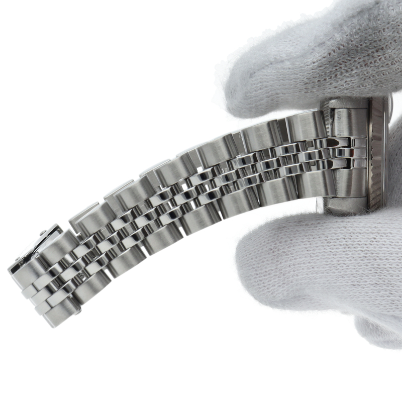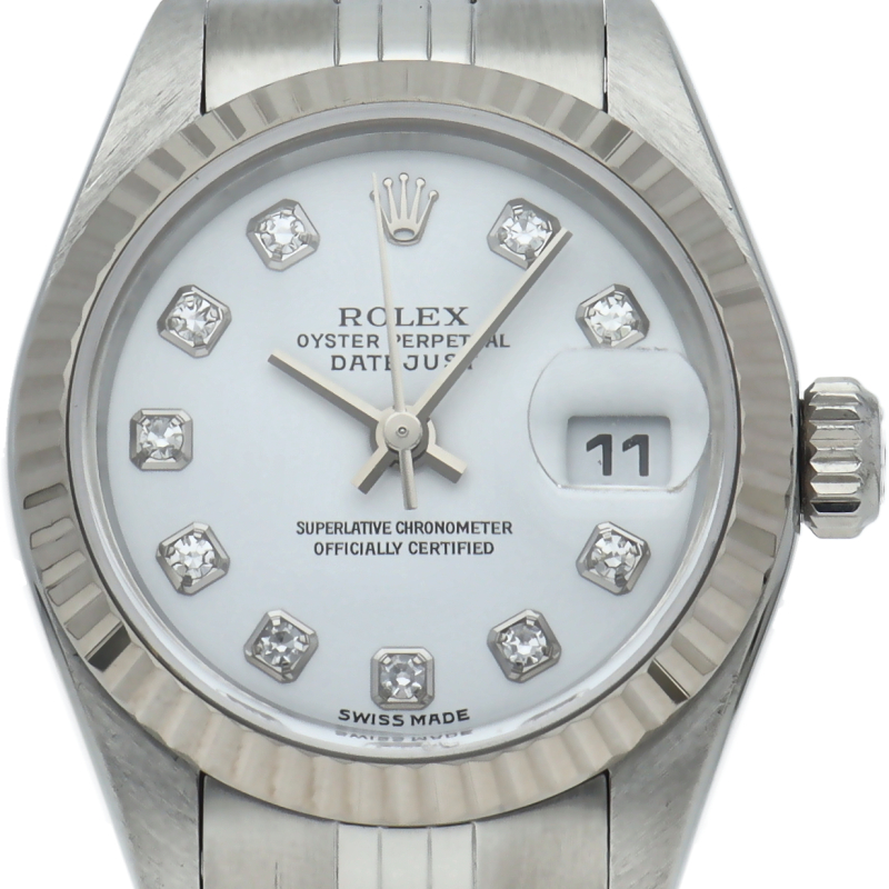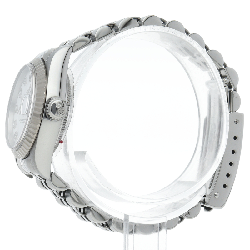 ロレックスのドレスウォッチで幅広い年齢層に愛されているデイトジャスト。ホワイトゴールドとステンレスのコンビ仕様に10Pダイヤが施され豪華です。