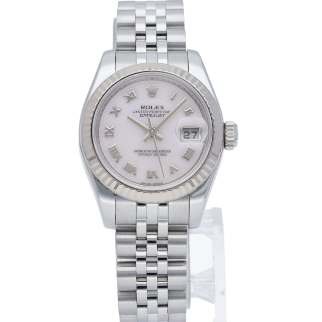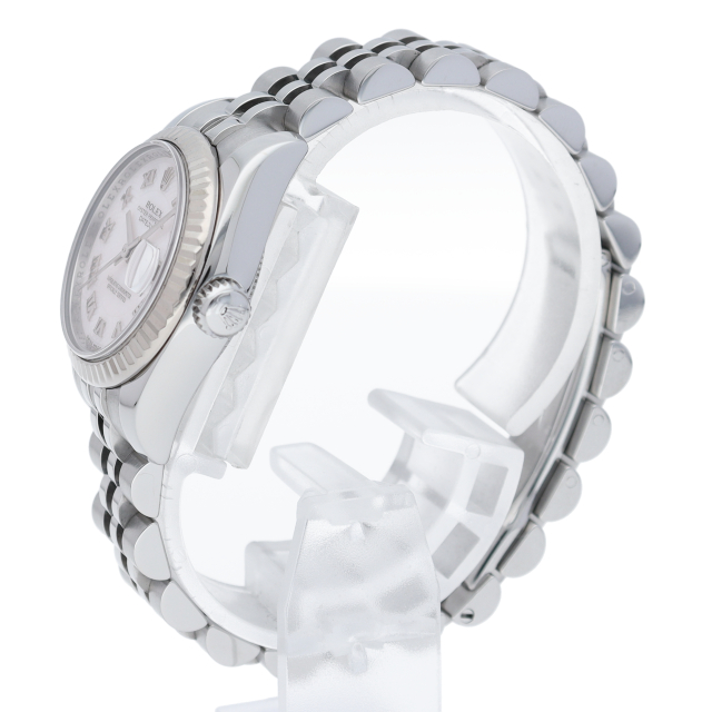男女問わず永遠のステータスシンボルとも言えるロレックスの“デイトジャスト”。様々なバリエーションがありますが、こちらは ピンクシェル文字盤にデコレーション(格子模様)を施した希少性の高いモデルです。ゴールドの光沢にも負けないピンクシェルの柔らかな光沢感が魅力です。