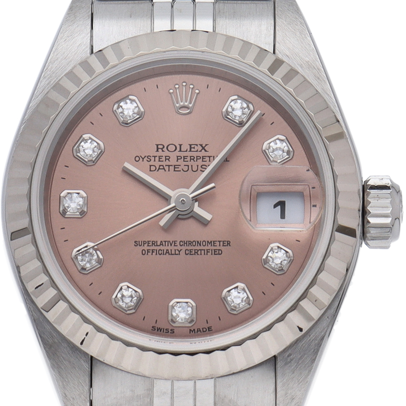 ロレックスのドレスウォッチで幅広い年齢層に愛されているデイトジャスト。ホワイトゴールドとステンレスのコンビ仕様に10Pダイヤが施され豪華です。